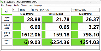Таким образом, набор для довольно тонкого ноутбука отнюдь не бедный, странным является интерфейс USB 2.0 для второго порта Type-C, но то же самое мы видели в ранее побывавшем у нас ноутбуке Digma Pro Fortis M на платформе AMD. Причем это не ошибка в описании: мы запускали тест CrystalDiskMark, подключая к обоим таким портам внешний SSD с интерфейсом USB-C (пришлось делать это в автономном режиме, чтобы освободить второй порт), а затем этот же накопитель через переходник к двум портам USB-А, сравнение результатов говорит само за себя: