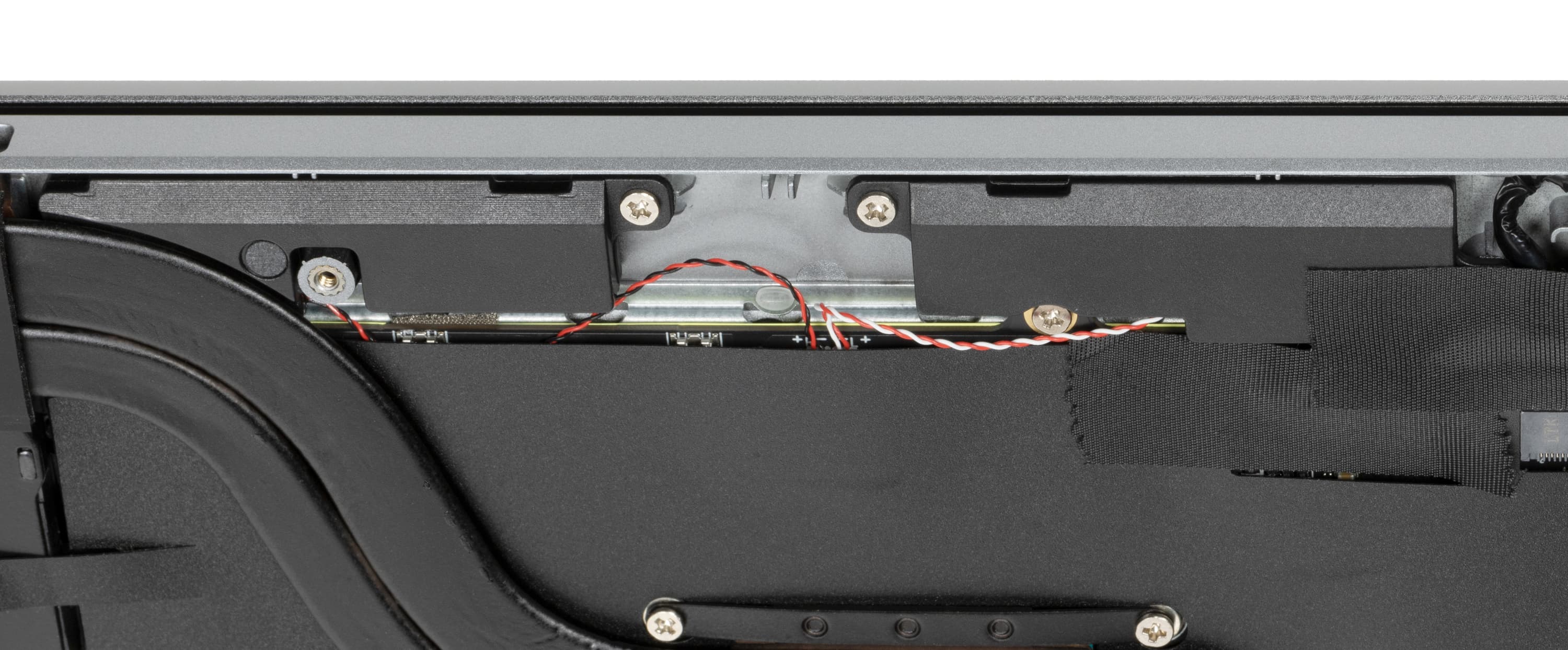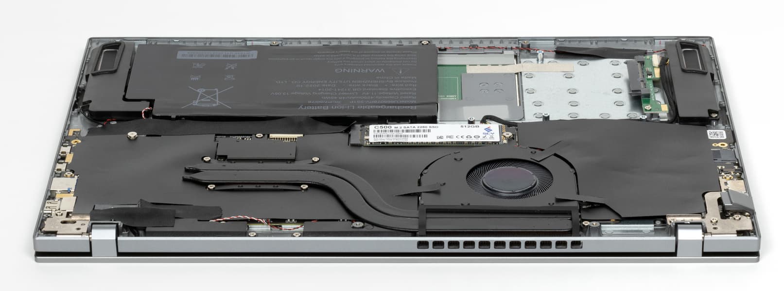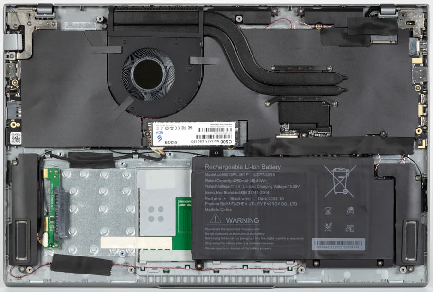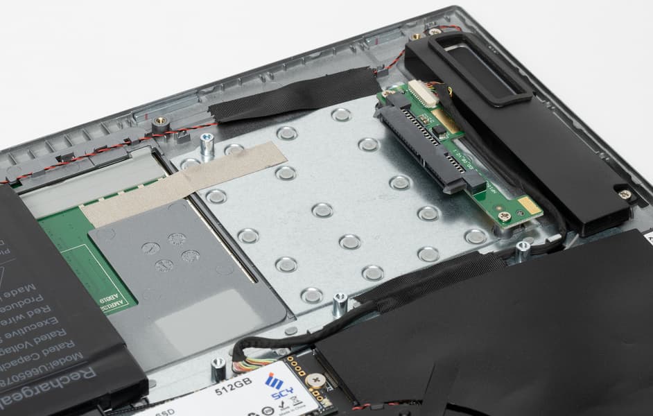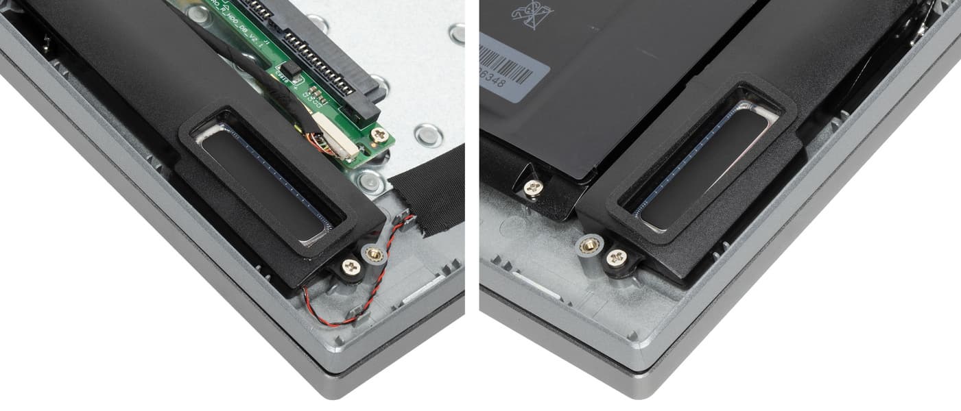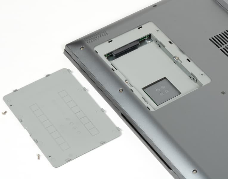 Для демонтажа нижней крышки потребуется обычная отвертка с крестообразным шлицем (Philips Type). С ее помощью нужно отвернуть 12 винтов плюс два винта крышки отсека для накопителя и два винта внутри этого отсека, фиксирующие металлические салазки. Затем при помощи пластиковой карты нужно разъять пластмассовые защелки. После демонтажа нижней панели открывается вид на внутренности ноутбука, которые, кстати говоря, заклеены листами черного пластика. Оперативная память распаяна на плате, и с этим ничего не поделаешь, но возможна замена системного накопителя и установка дополнительного SSD во второй свободный слот M.2 (оба SATA 6). Батарея крепится к корпусу винтами и подключается к собственному разъему, извлекается и устанавливается достаточно просто и быстро.