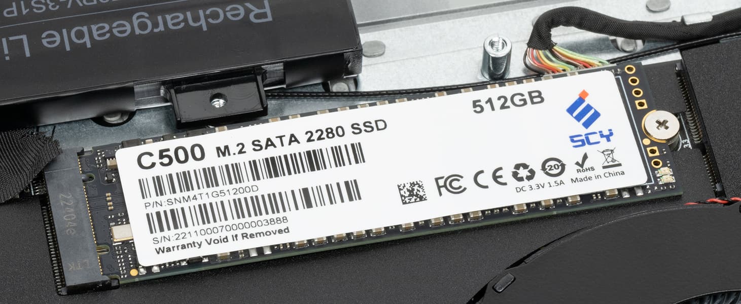 Системный накопитель SCY C500 вместимостью 512 ГБ хотя и установлен в слоте M.2, но обладает интерфейсом SATA, а не PCIe — сегодня это решение следует считать устаревшим.