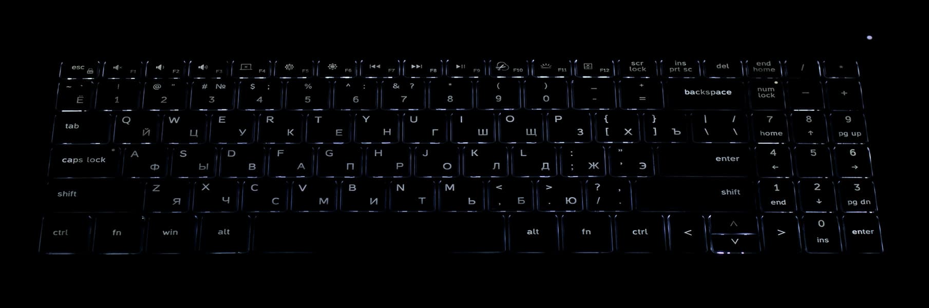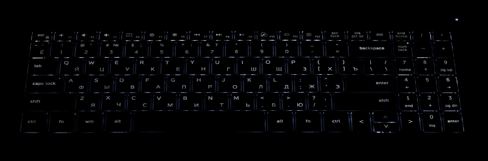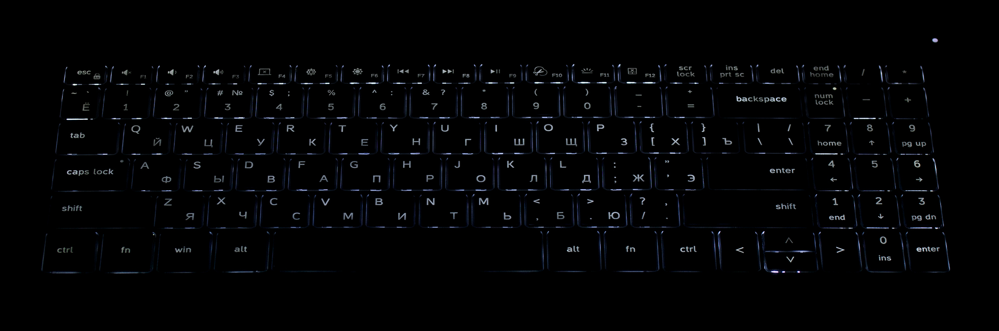 Клавиатура снабжена подсветкой с двумя уровнями по яркости (третье состояние — выключена). Иллюминированы символы на клавишах и немного — их контуры. Распределение света позволяет в равной мере легко различать в темноте символы и латинской, и русской раскладки. Регулировка яркости производится последовательным нажатием Fn+F11.