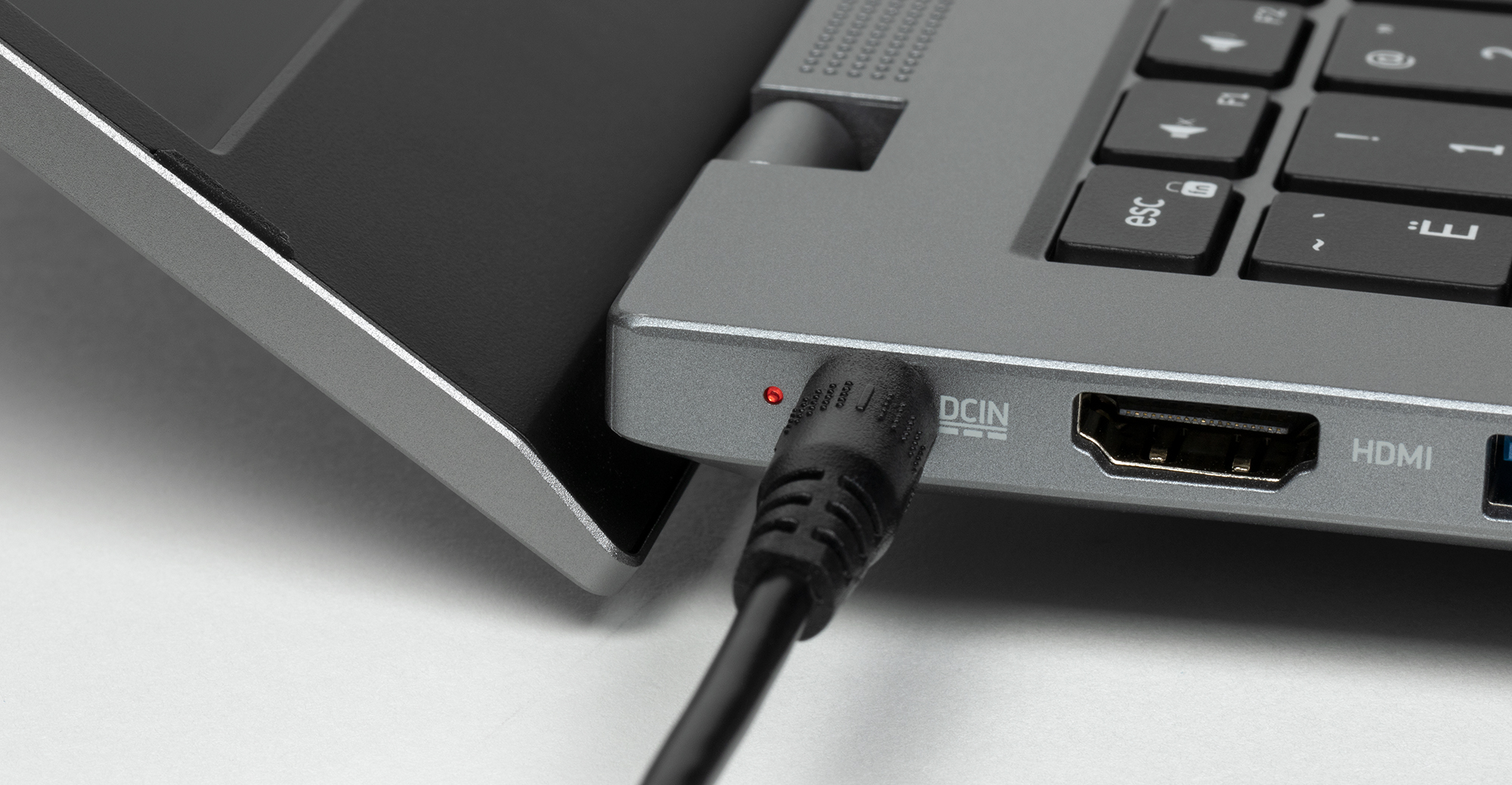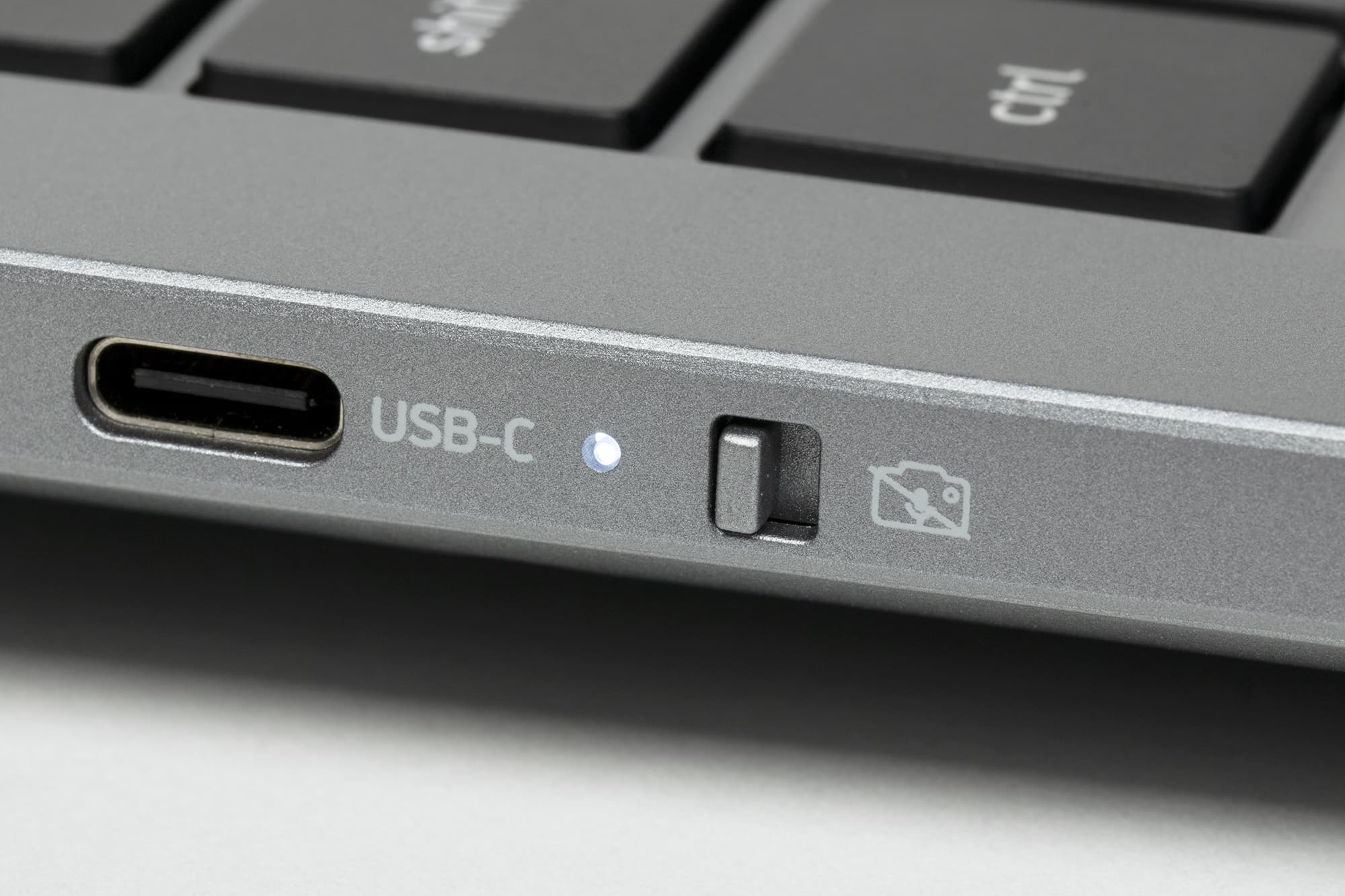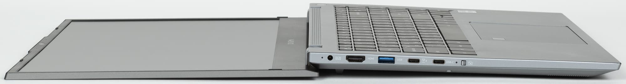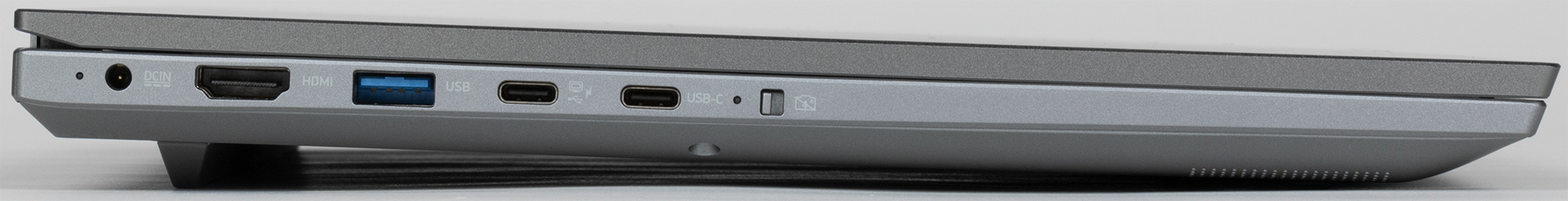 На левой боковой панели помещаются индикатор заряда батареи, коннектор адаптера питания, видеовыход HDMI, три порта USB 3.0: один Type A и два Type С (левый поддерживает видеовыход DisplayPort и Power Delivery). Последним (правым) элементом является выключатель веб-камеры с индикатором ее активности.