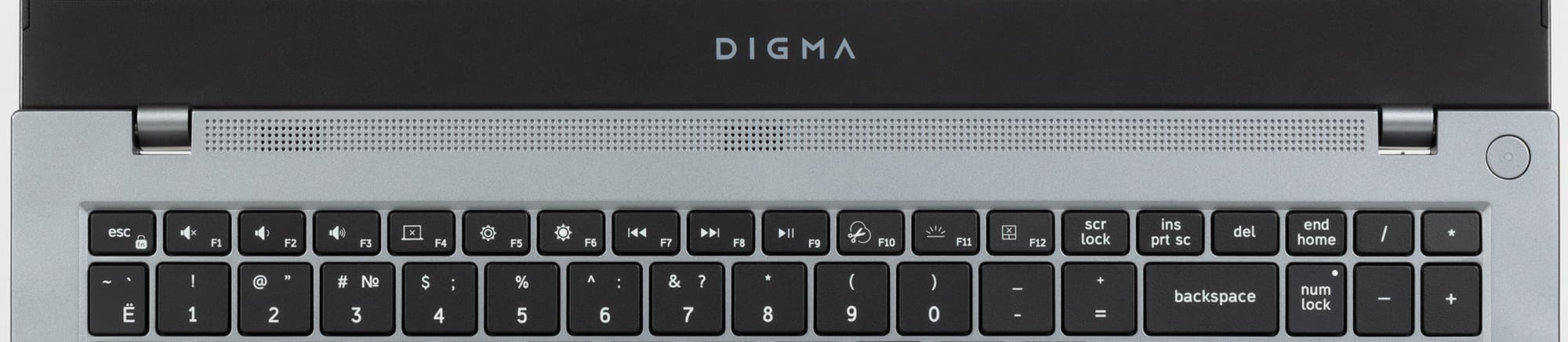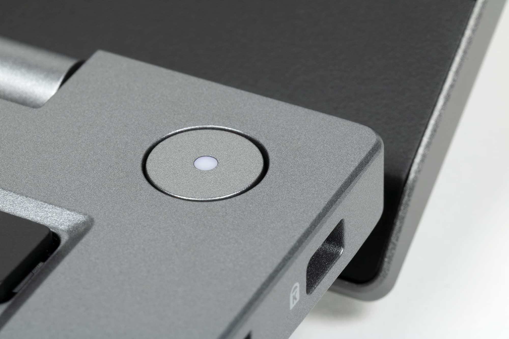 Кнопка выключателя питания вынесена за пределы клавиатурного поля. Она того же металлического вида, что и лицевая панель, имеет форму правильного круга, а не прямоугольника, содержит в центре собственный индикатор и утоплена ниже плоскости панели, поэтому случайные нажатия исключаются.