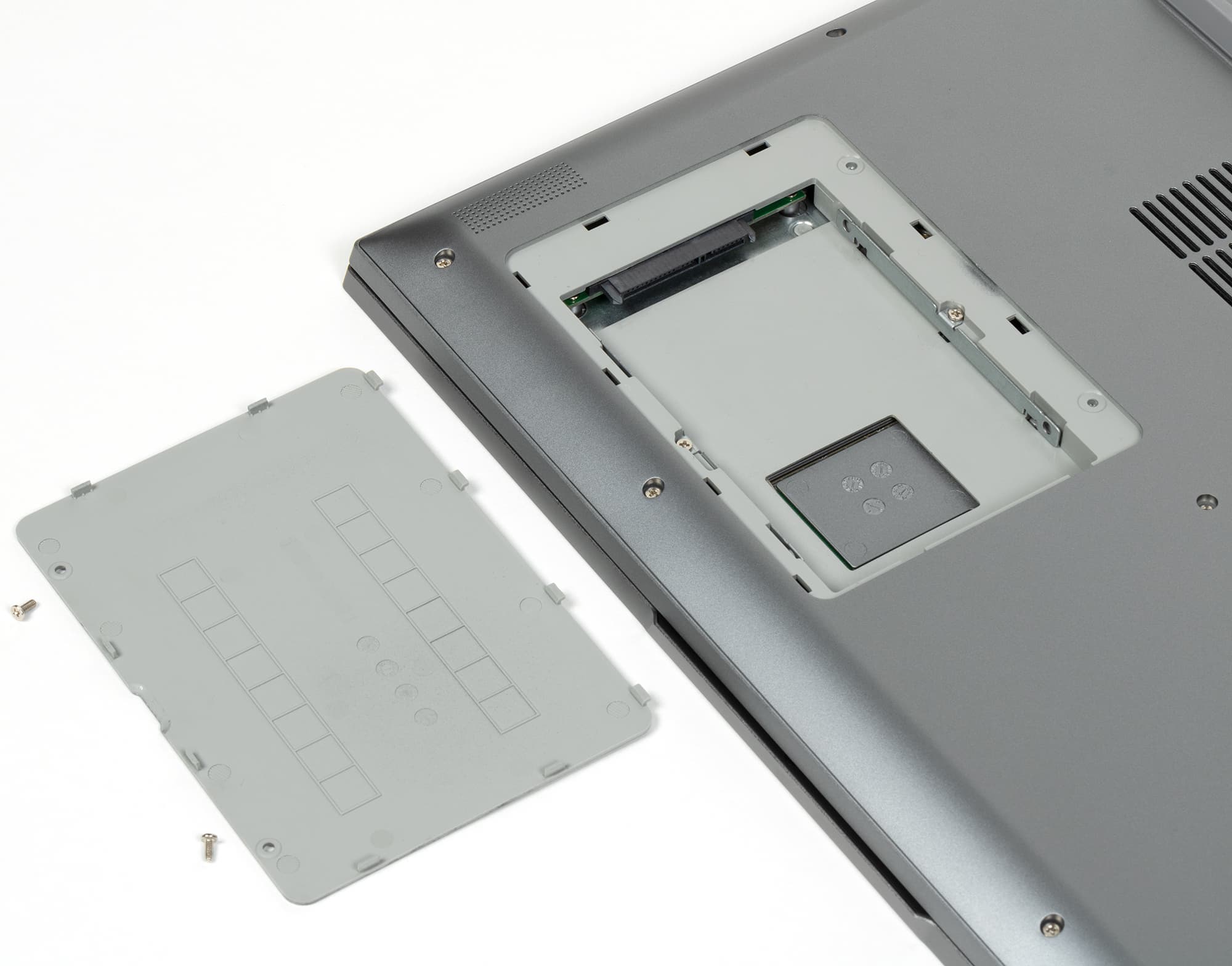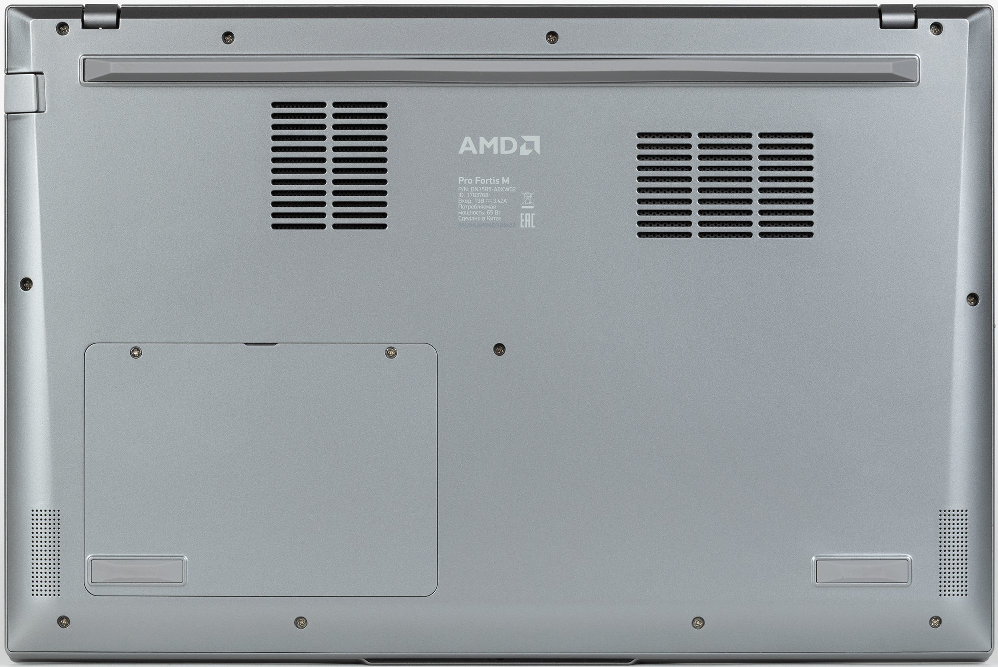 Днище имеет простейший рельеф поверхности, где обращают на себя внимание логотип AMD, довольно скромные по площади решетки воздухозаборников, массивная задняя опора плюс две тонких передних, а также крышка отсека для второго накопителя (жесткого диска или SSD) форм-фактора 2,5 дюйма.