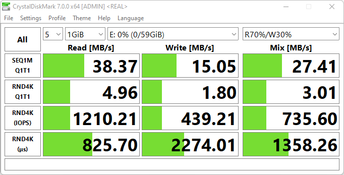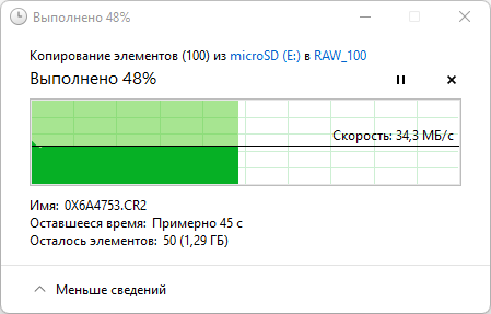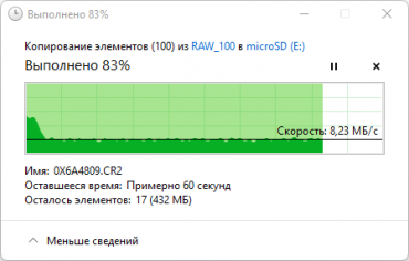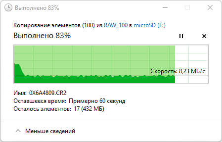 В реальной жизни важнее приведенные ниже скорости файловых операций, выполняемых средствами операционной системы. Мы проводили их в два раунда: путем копирования 100 файлов цифровых фотографий (общий объем 2,5 ГБ) с microSD на рабочий стол ноутбука и затем наоборот, с рабочего стола на носитель.
