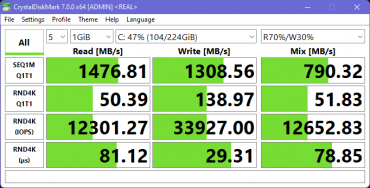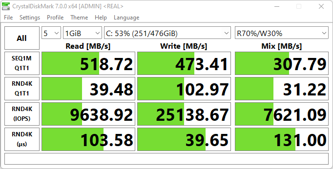 Системный накопитель нашего подопечного расплачивается за несовершенство и отсталость интерфейса: SATA не в состоянии тягаться с PCI Express, и этим обусловлен проигрыш Digma Pro Fortis M в заочном соревновании системных накопителей. Превосходство над ним победителя (Infinix Inbook X2 Plus) пятикратное, а серебряного призера состязаний (MSI Modern 15) — почти трехкратное.