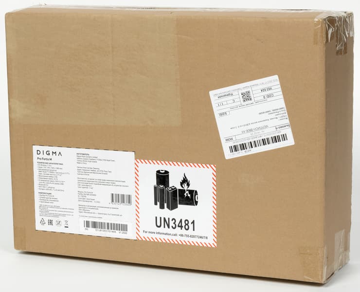 Приступим к изучению Digma Pro Fortis M доступными нам средствами. Вначале обратимся к внешнему виду упаковки ноутбука. Здесь тоже есть признаки экономичного подхода, правда, они относятся лишь к внешней (транспортировочной) таре.