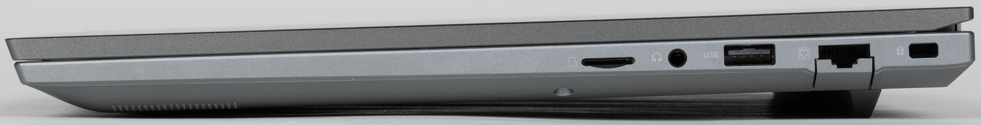 Справа расположены слот картовода для microSD, комбинированный разъем для аудиогарнитуры, порт USB 2.0 Type A, розетка RJ-45 для кабеля Ethernet и отверстие кенсингтонского замка.
