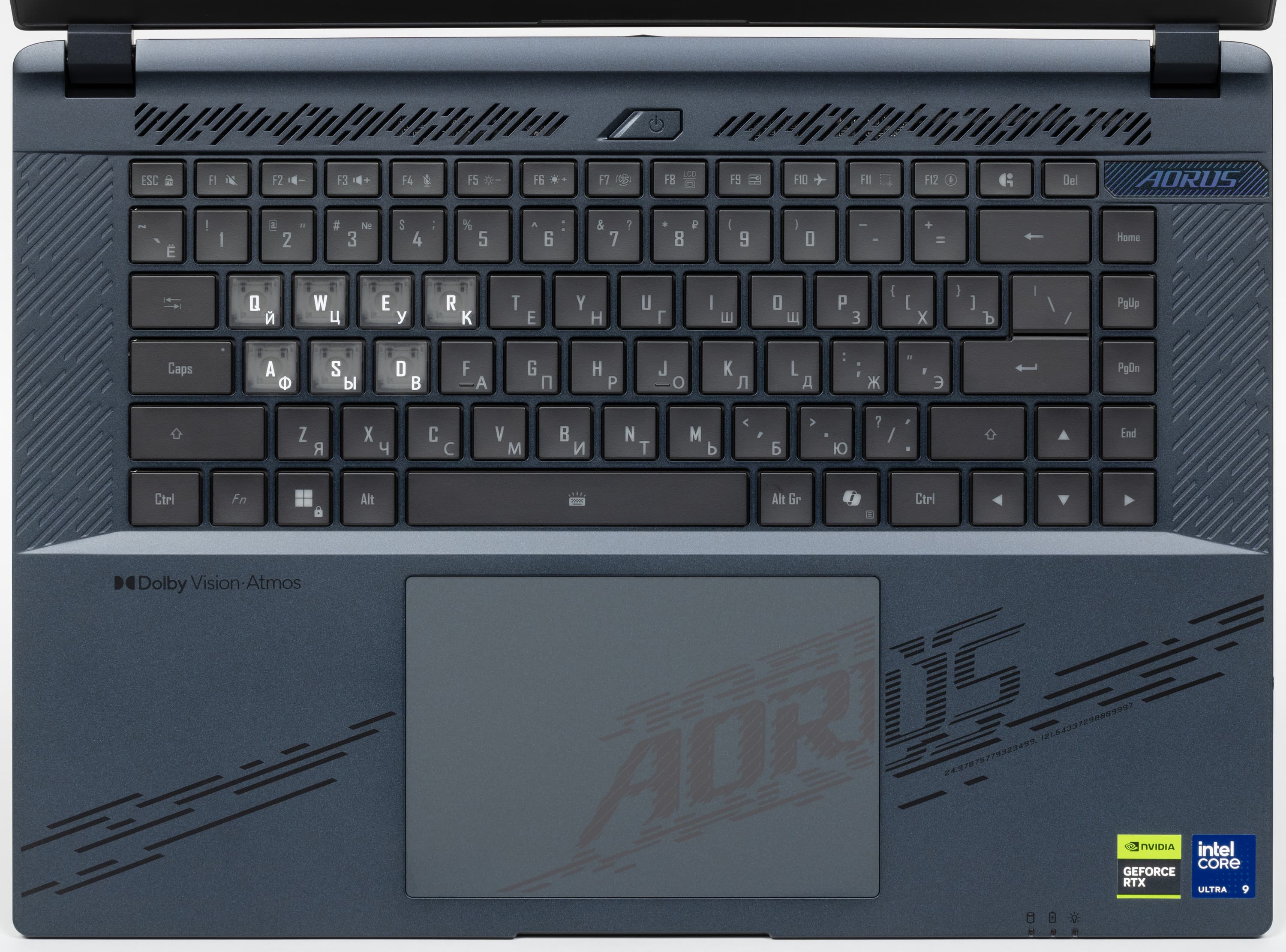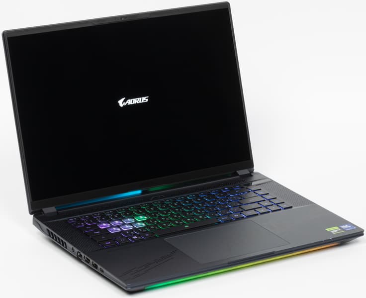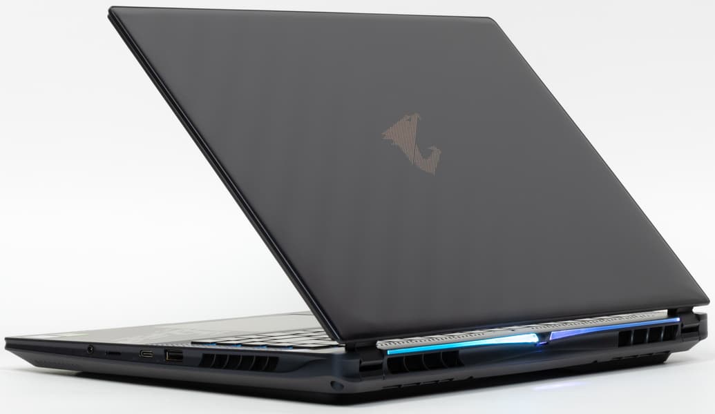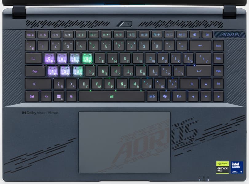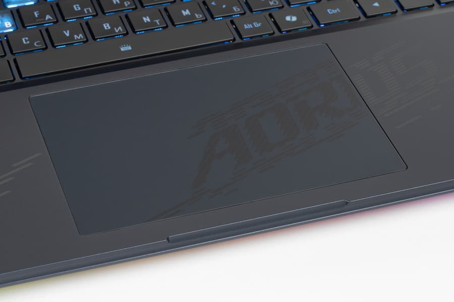 Внешне ноутбук повторяет облик своего предшественника Aorus 16X ASG (несколько видоизменена только лицевая панель, да и то лишь за счет нанесения декоративной гравировки с именем серии. Поверхность крышки по фактуре традиционная, поэтому отпечатки пальцев на ней собираются легко и быстро, а удаляются только с приложением специальных мер. В центре красуется логотип серии Aorus.