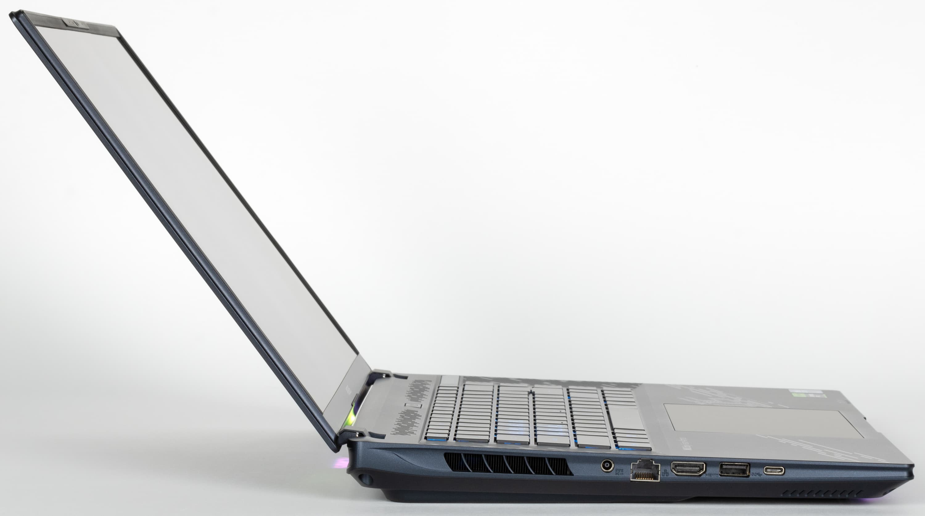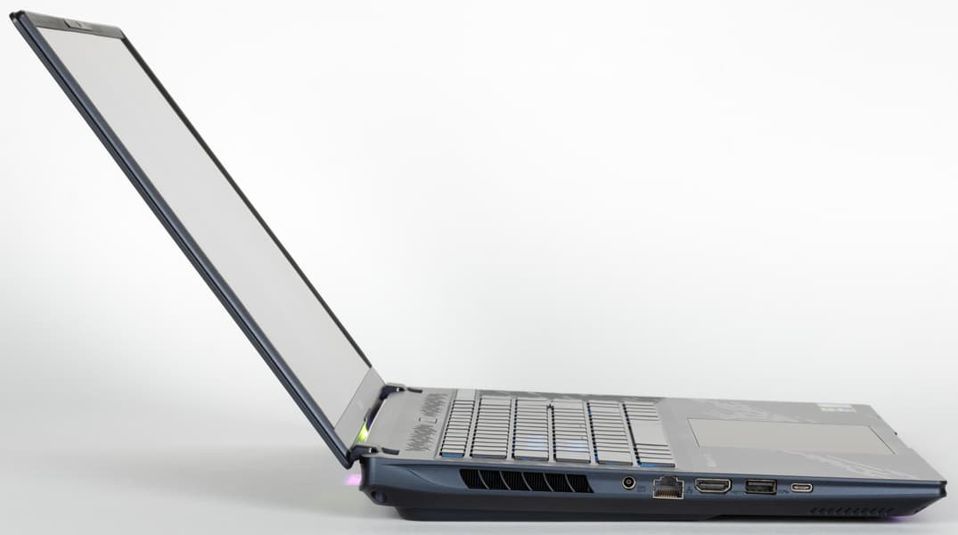 В ноутбуке используется 16-дюймовая OLED-матрица с разрешением 2560×1600 пикселей (отчет edid-decode). Для экрана обещаны соответствие критериям VESA Certified Display HDR True Black 500 и цветовой охват 100% пространства DCI-P3. Лицевая поверхность экрана изготовлена из стеклянной пластины, устойчивой к появлению царапин. Экран снаружи зеркально-гладкий. Улучшенных антибликовых свойств, снижающих яркость отраженных объектов, нет, однако по антибликовым свойствам экран этого ноутбука чуть-чуть лучше экрана планшета Google Nexus 7 (2013). Олеофобного покрытия нет. Впрочем, причин трогать экран тоже нет, так как он не сенсорный.