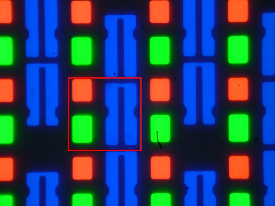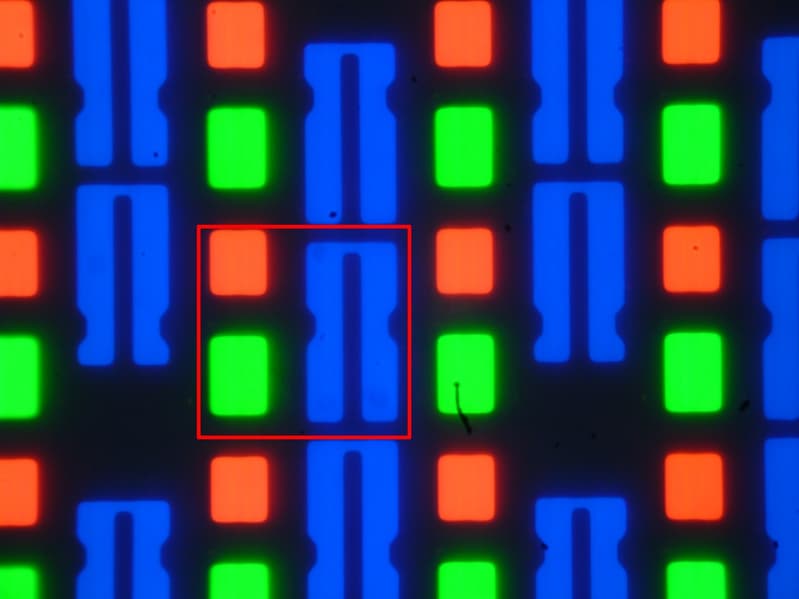 В экране ноутбука используется матрица типа OLED — активная матрица на органических светодиодах. Полноцветное изображение создается с помощью субпикселей трех цветов — красного (R), зеленого (G) и синего (B) в равном количестве — по три каждого вида на пиксель. Это подтверждается микрофотографией (в красной рамке — субпиксели, принадлежащие одному пикселю):