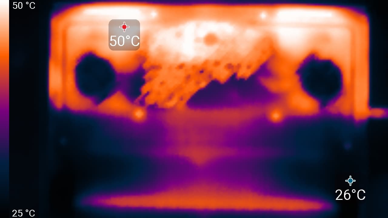 Нижние входные отверстия воздухозаборников располагаются под кулерами и центральной частью теплосъемного агрегата. У переднего края имеются решетки для выхода звука.