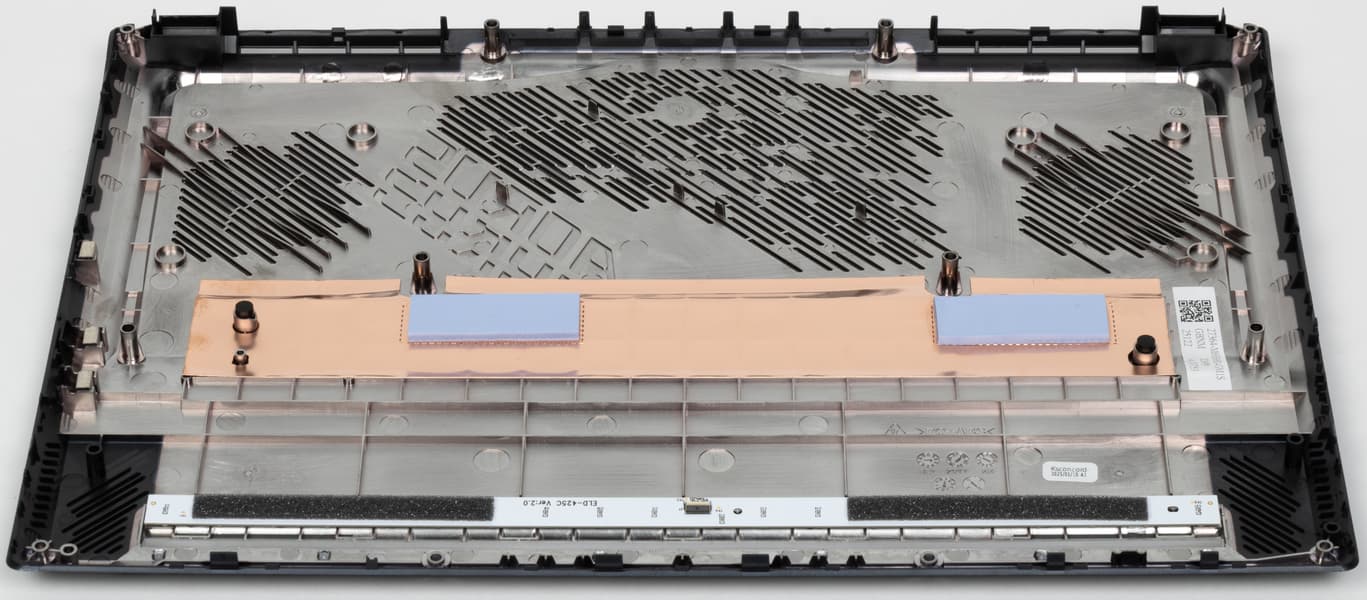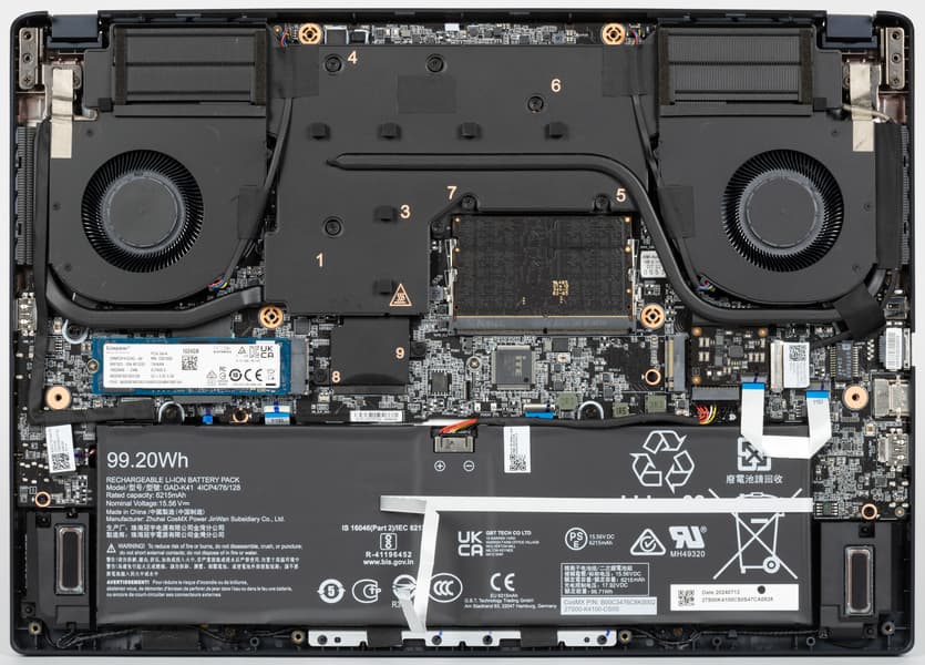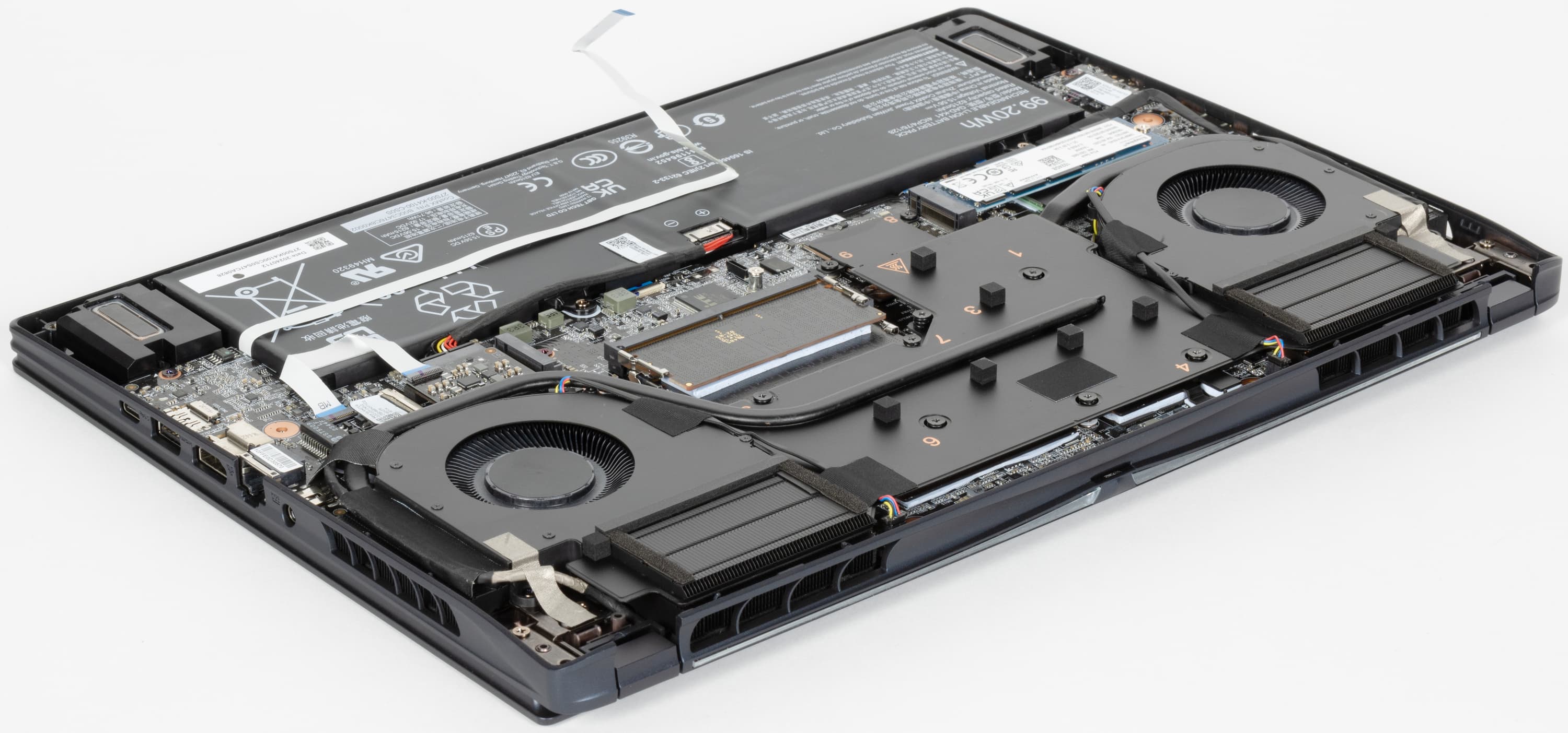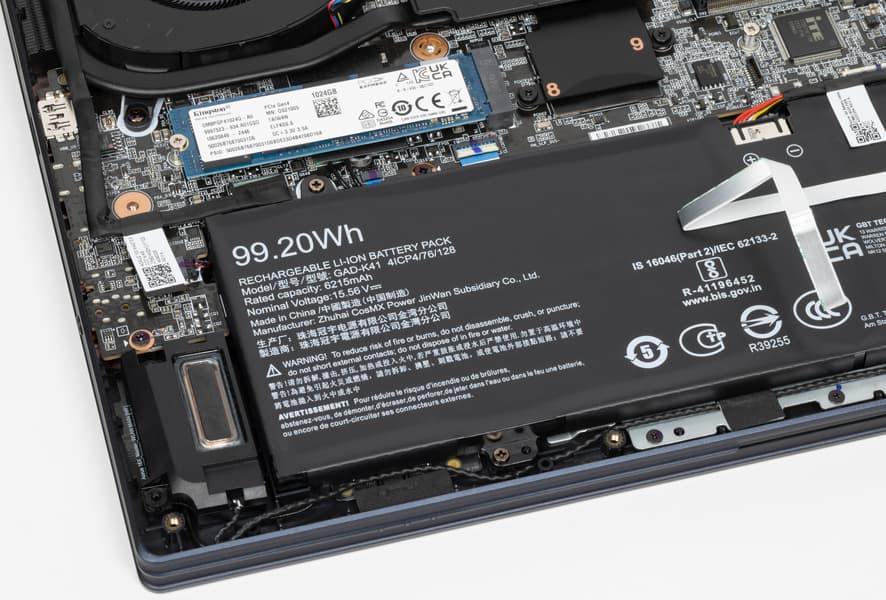 Наиболее приметные узлы конструкции — система охлаждения, блок со слотами SO-DIMM и аккумулятор. Аппаратная модернизация предусматривает возможность изменения конфигурации оперативной памяти, установку второго NVMe-хранилища в свободный слот M.2, замену беспроводного адаптера и батареи.