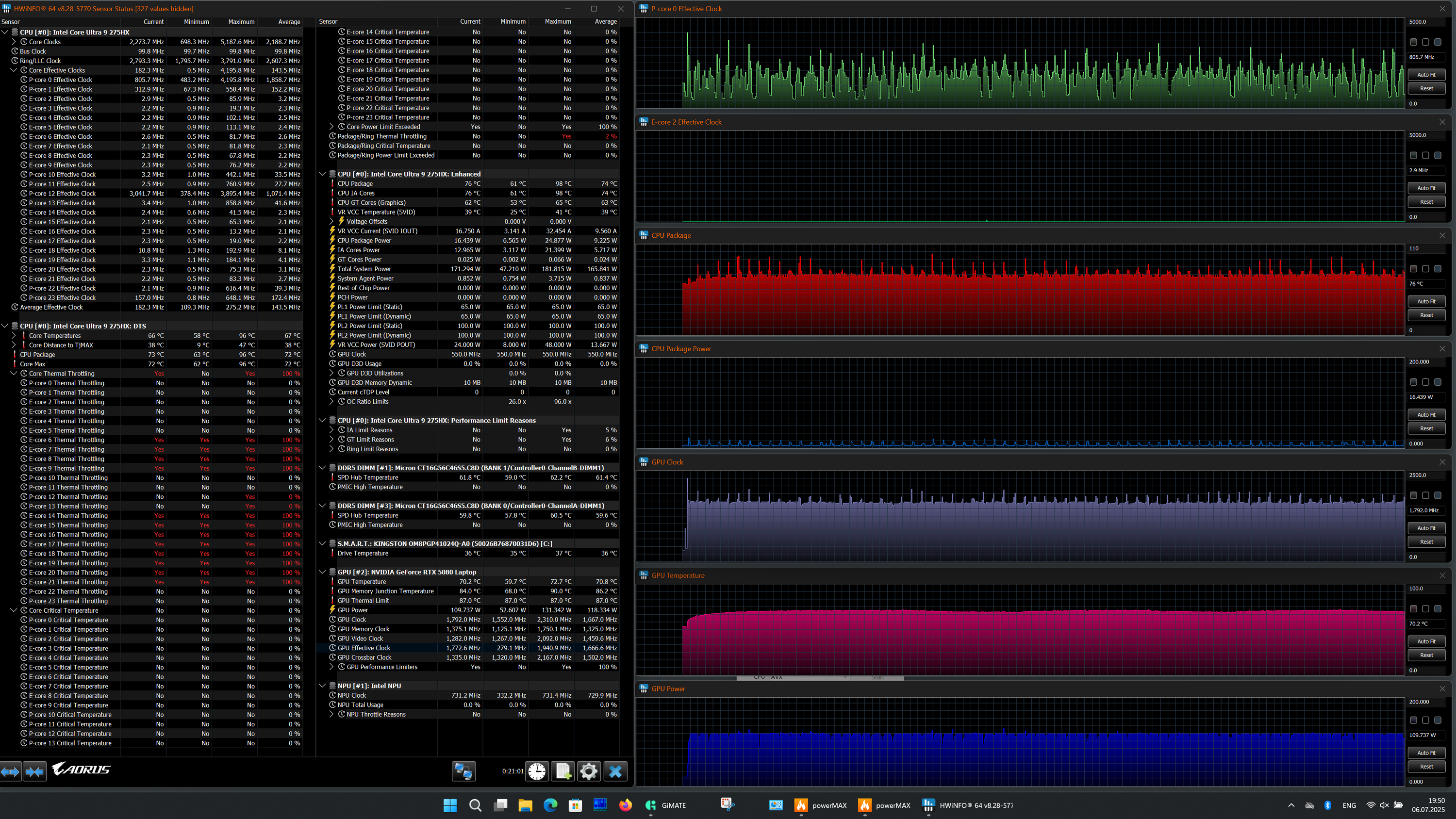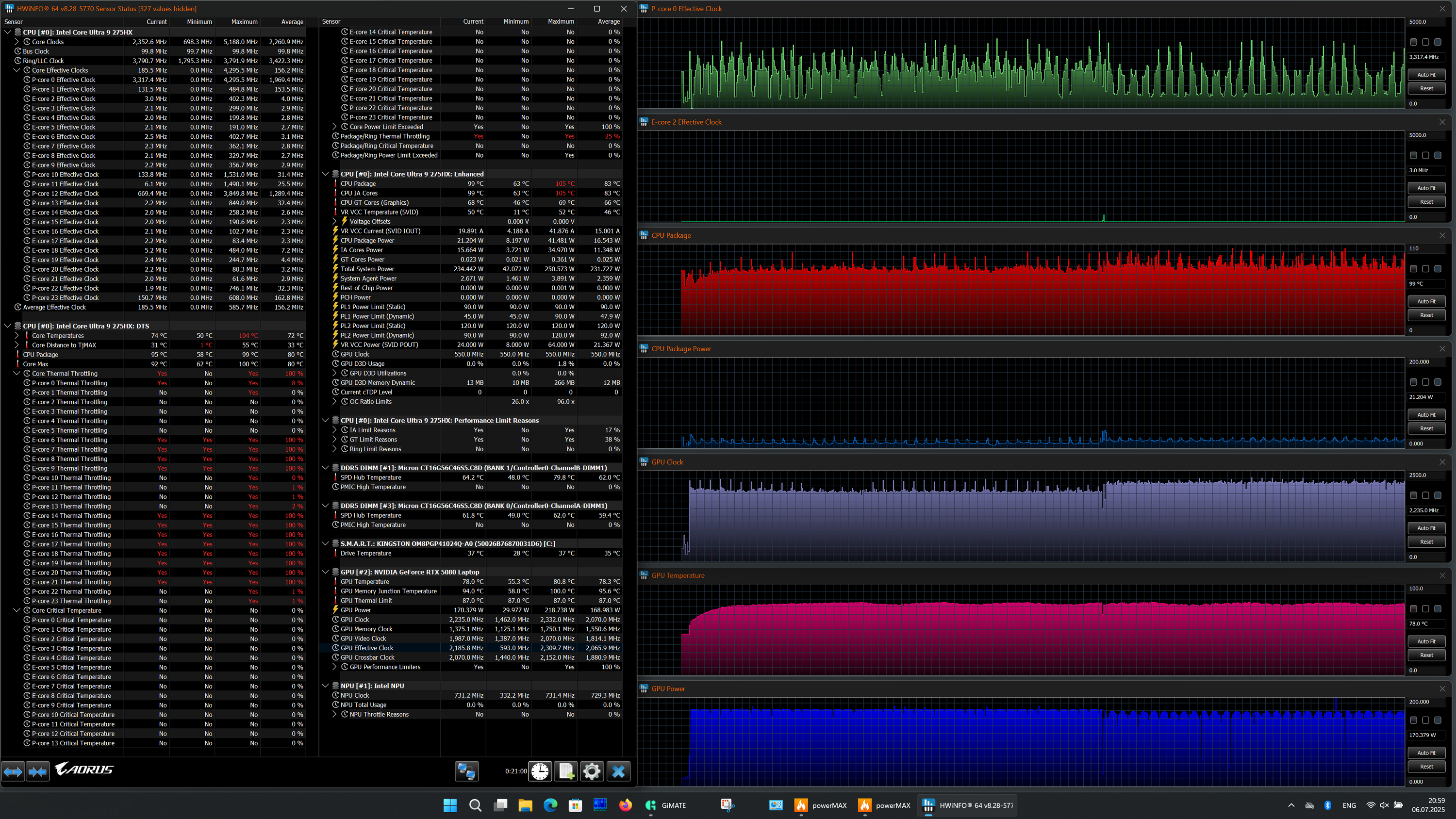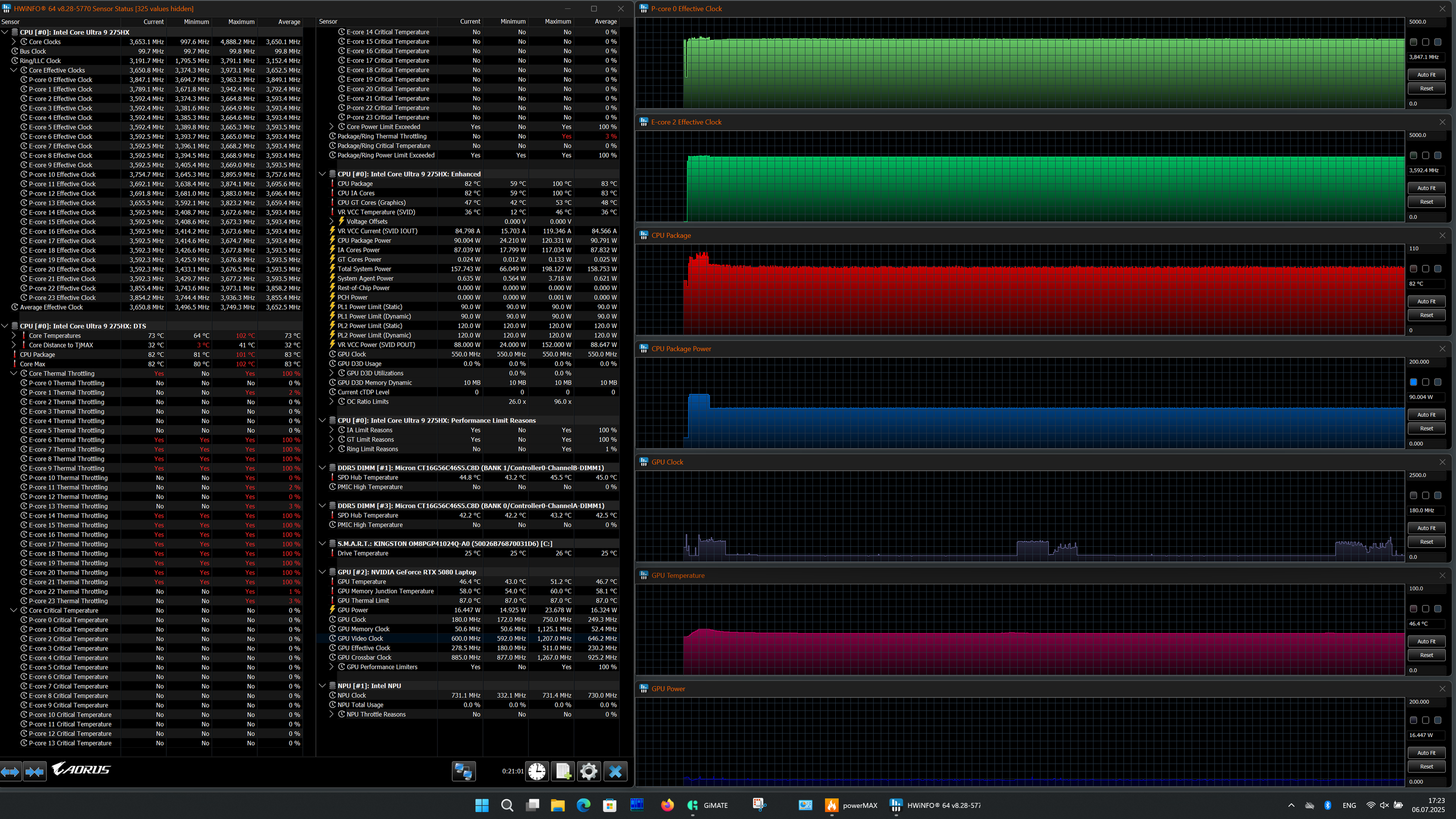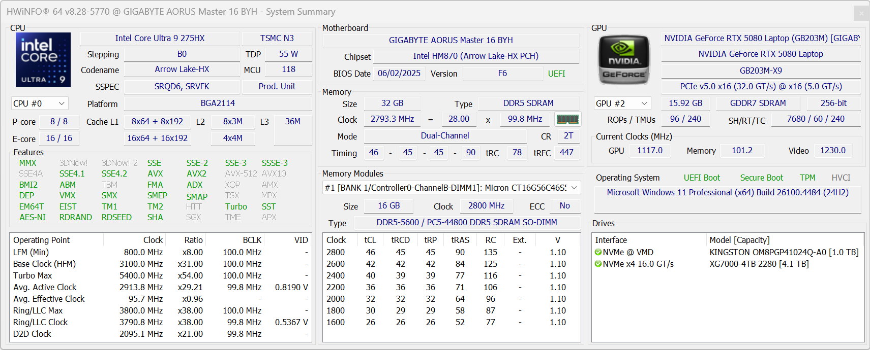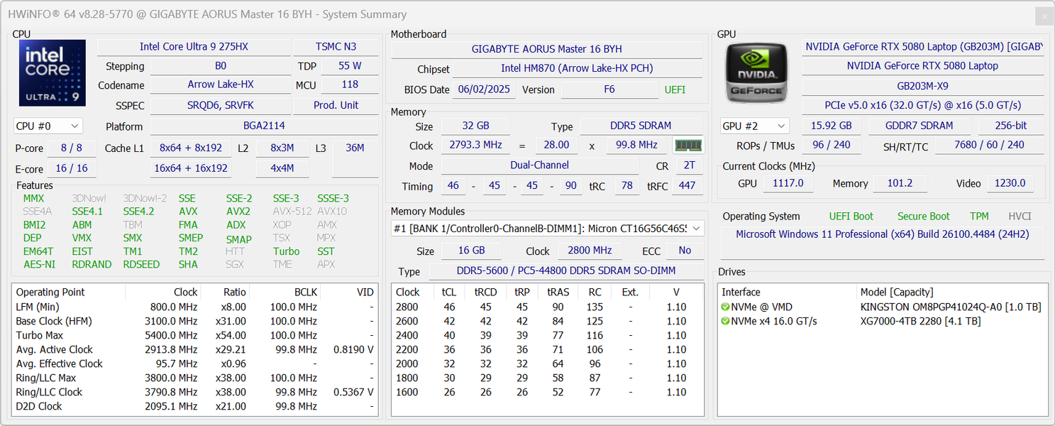 | Процессор | Intel Core Ultra 9 275HX: 8 P-ядер/8 потоков, 2,7 ГГц (Turbo 5,4 ГГц), 16 E-ядер/16 потоков; 2,1 ГГц (Turbo 4,6 ГГц); TDP 45—55 Вт (Turbo 160 Вт), Tjmax 105 °C | |