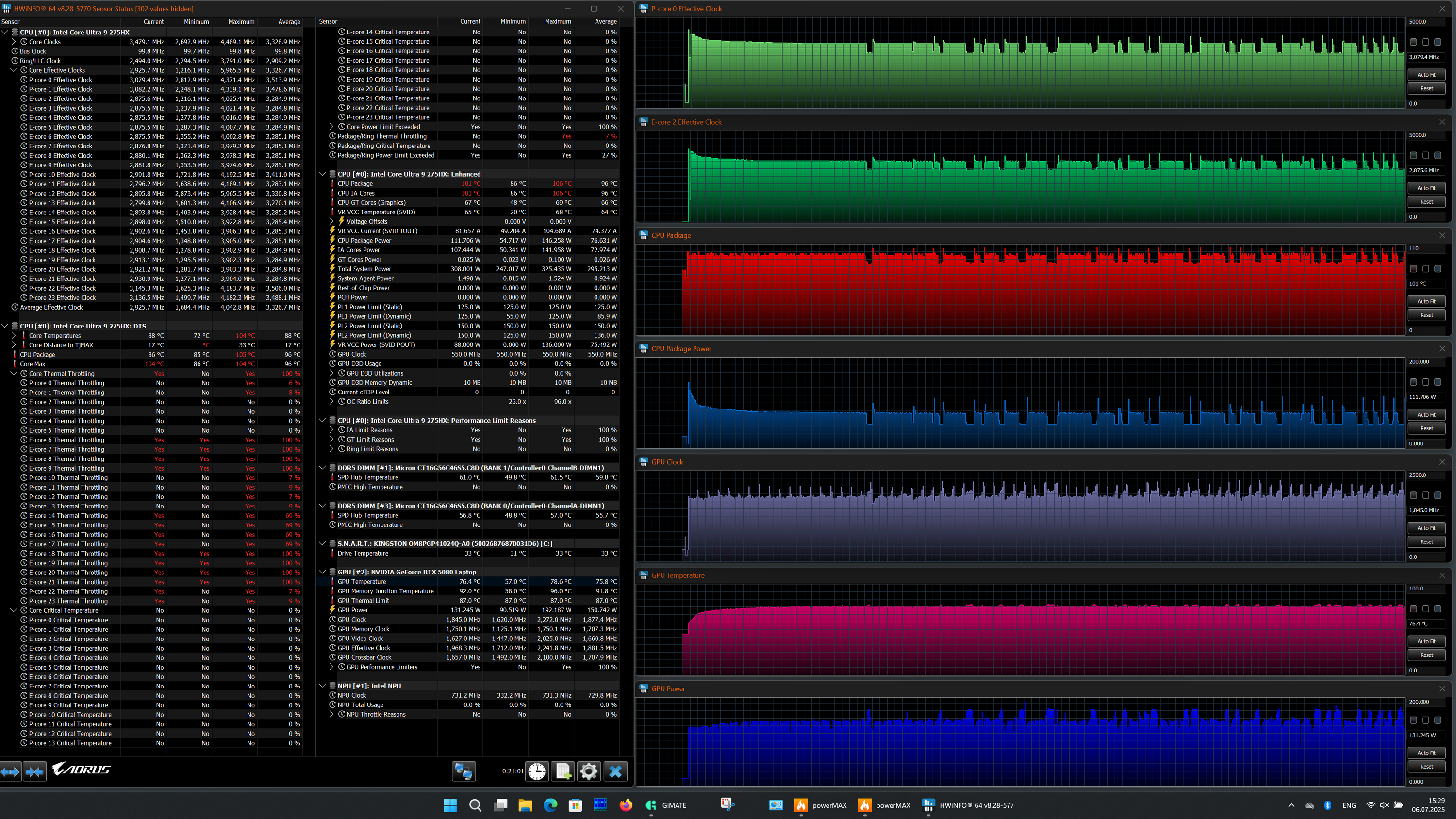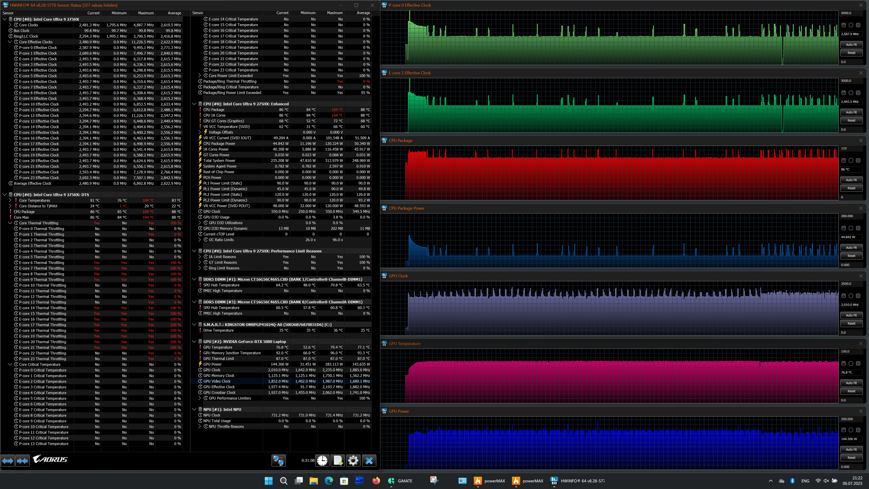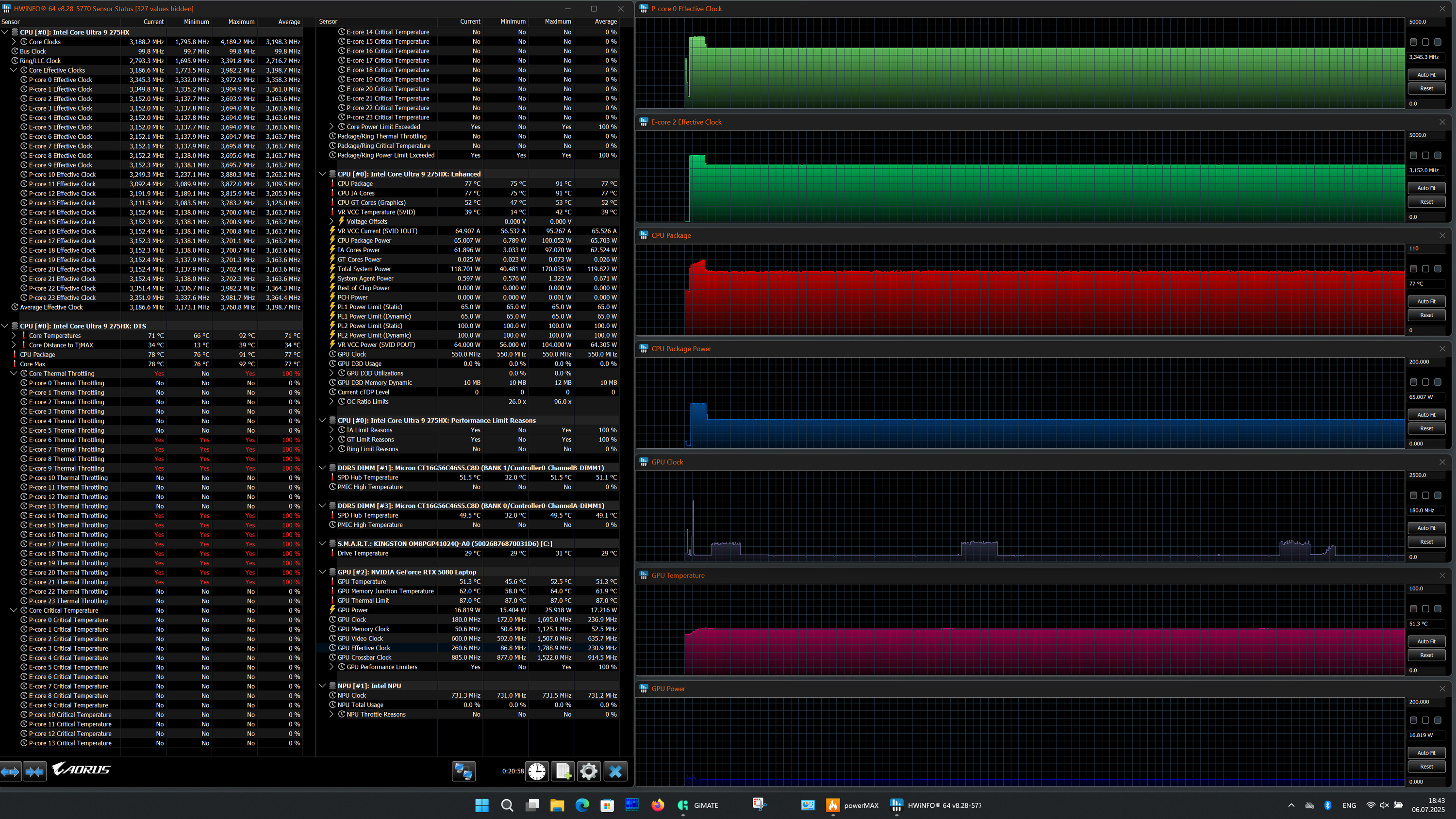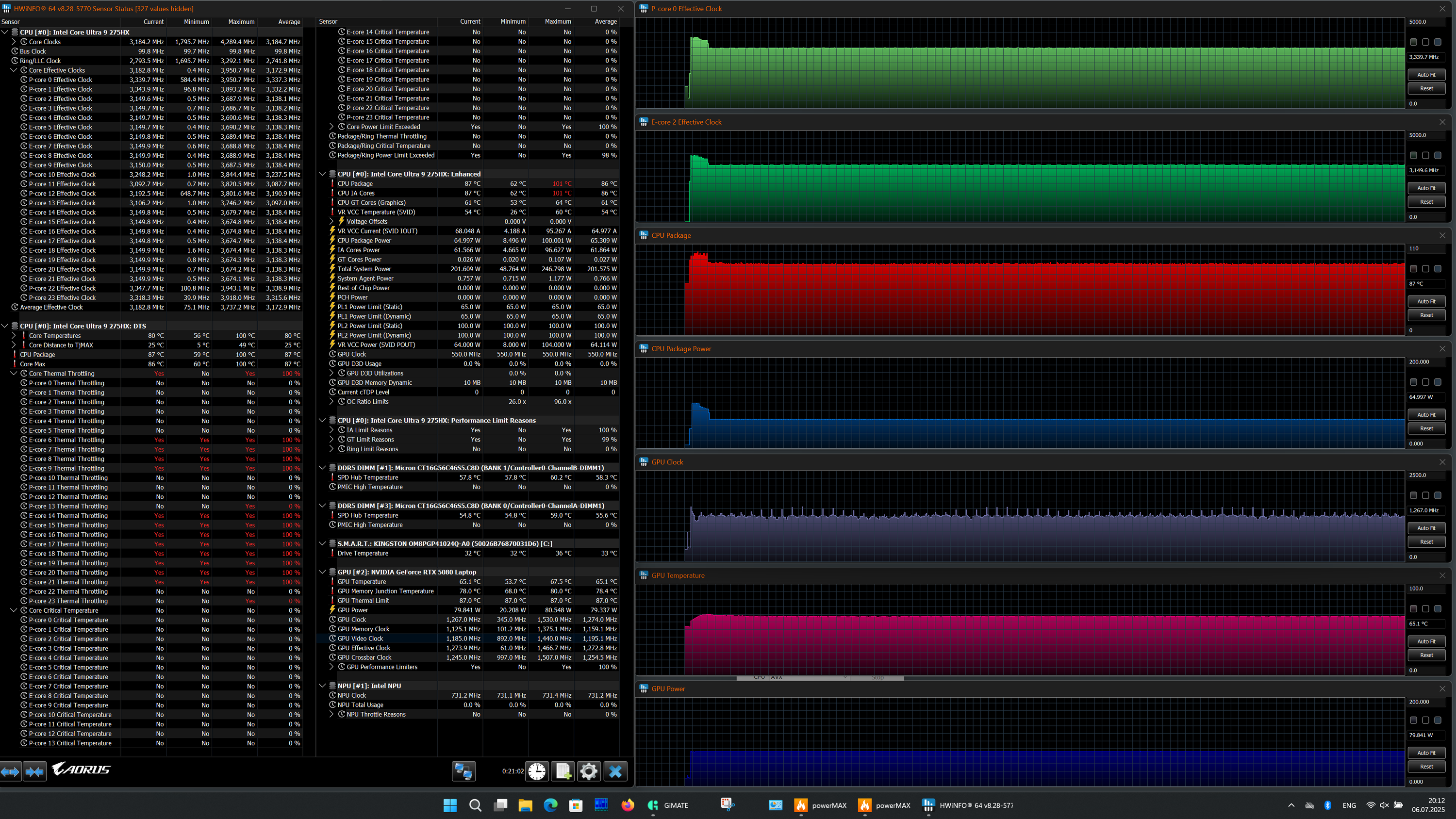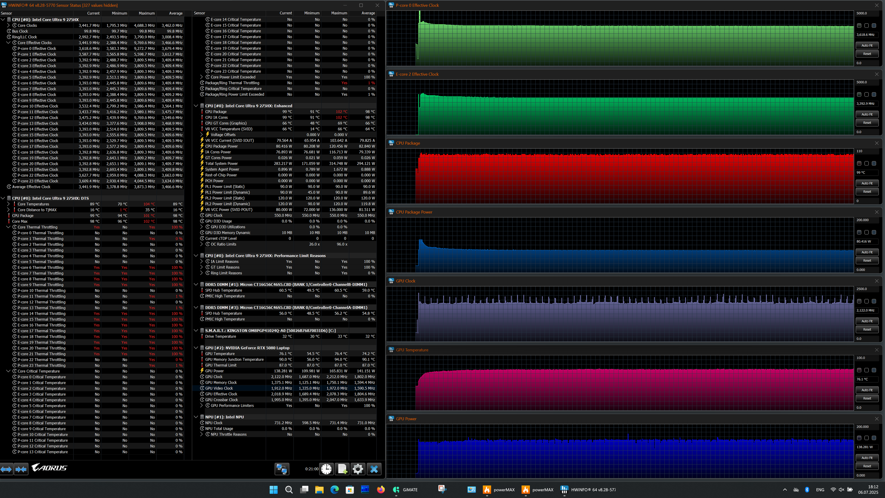 | Процессор | Intel Core Ultra 9 275HX: 8 P-ядер/8 потоков, 2,7 ГГц (Turbo 5,4 ГГц), 16 E-ядер/16 потоков; 2,1 ГГц (Turbo 4,6 ГГц); TDP 45—55 Вт (Turbo 160 Вт), Tjmax 105 °C | |