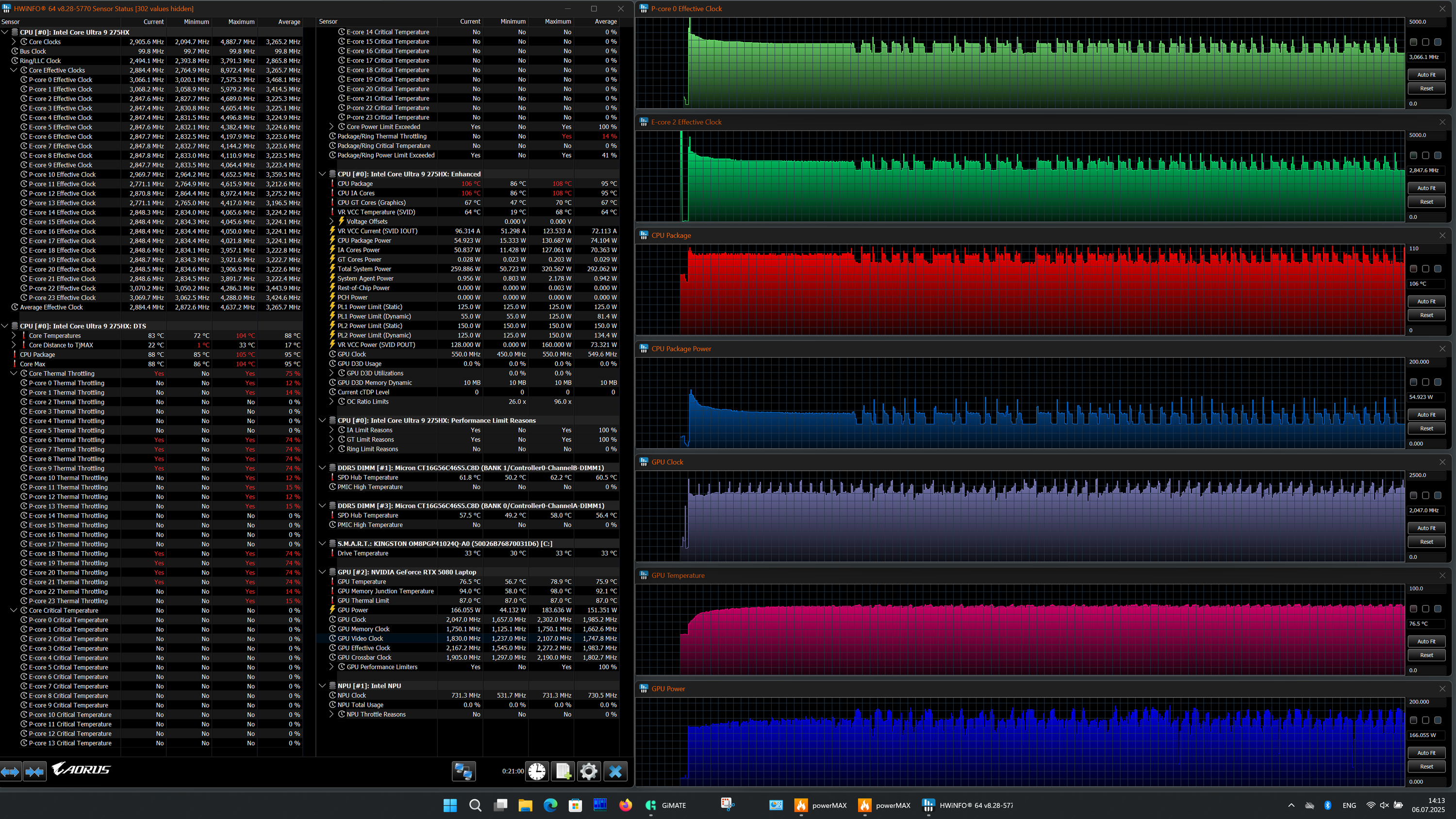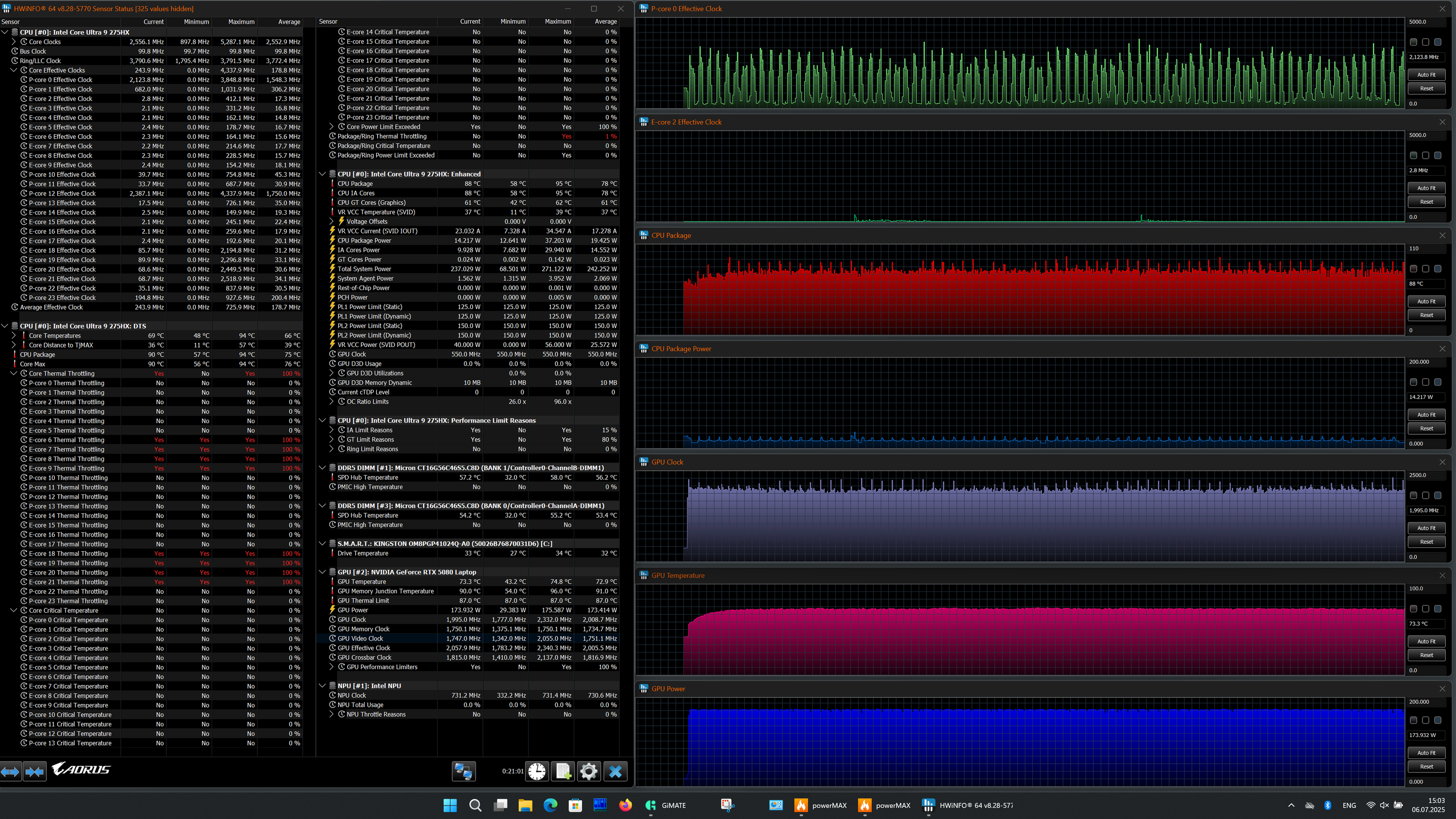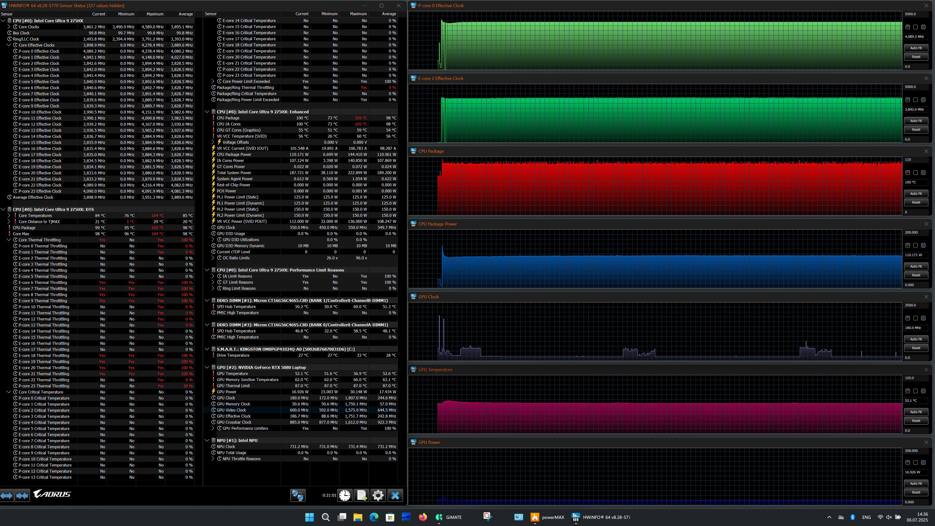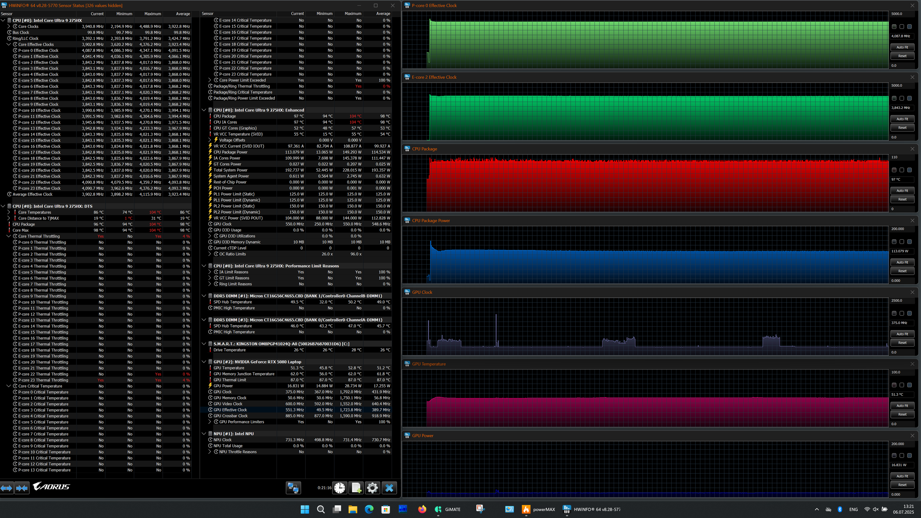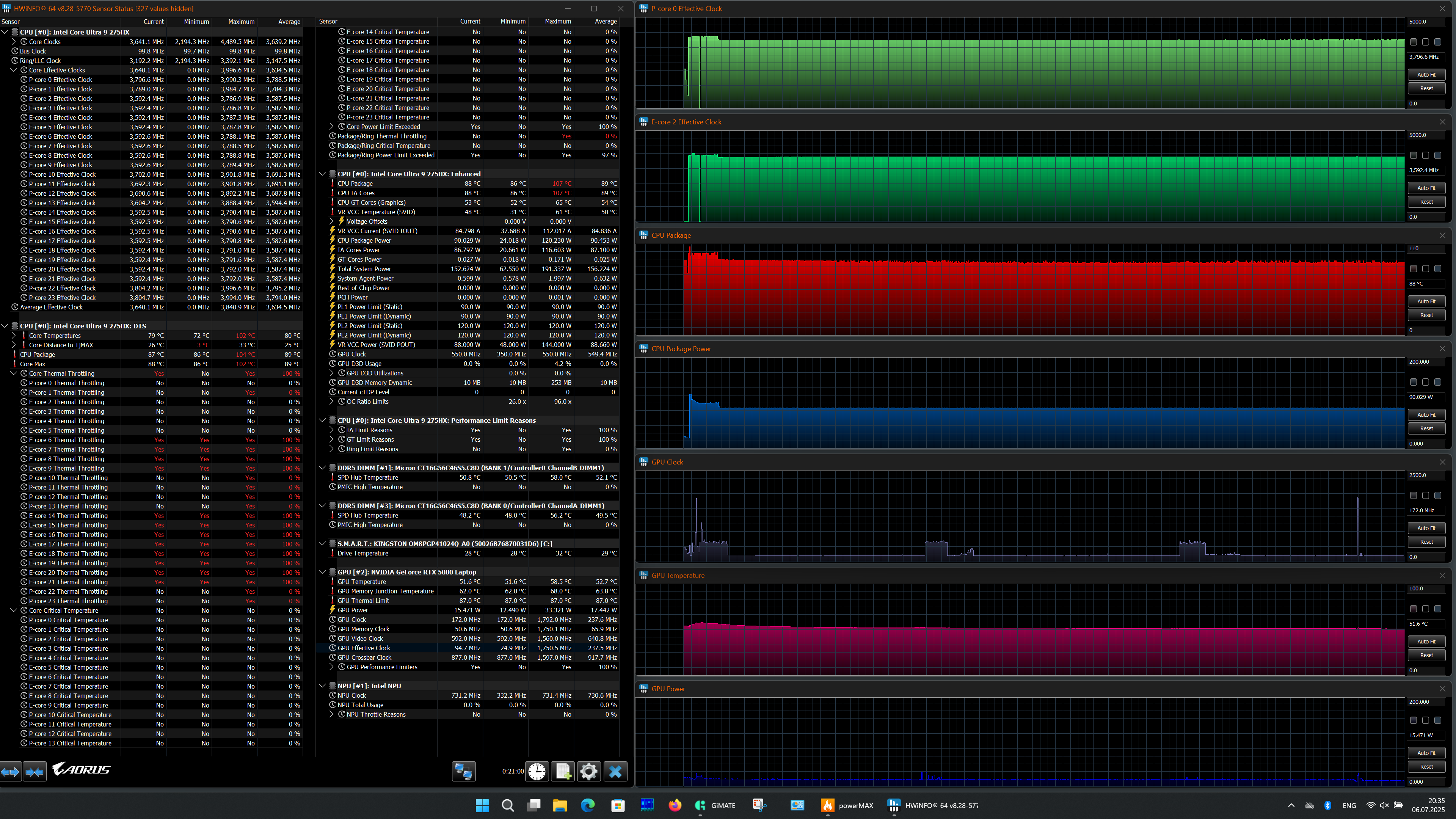 | Процессор | Intel Core Ultra 9 275HX: 8 P-ядер/8 потоков, 2,7 ГГц (Turbo 5,4 ГГц), 16 E-ядер/16 потоков; 2,1 ГГц (Turbo 4,6 ГГц); TDP 45—55 Вт (Turbo 160 Вт), Tjmax 105 °C | |