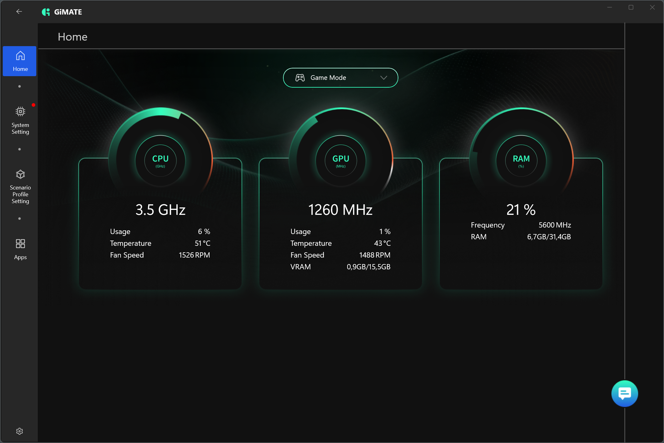 На вкладке Home помещается системный монитор и кнопка выбора режимов работы (на фото вверху в ней высвечивается Game Mode (игровой режим).