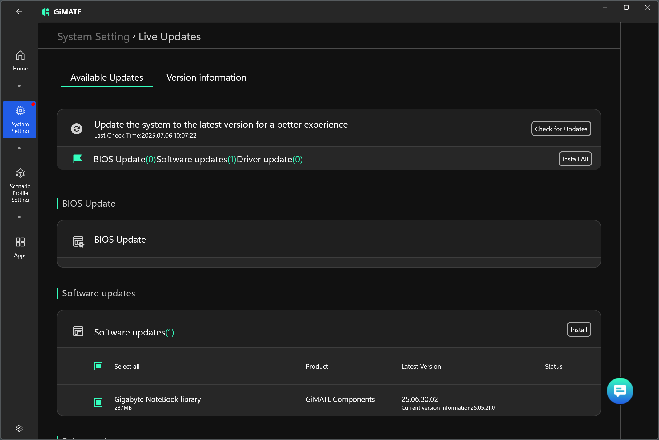 Вкладка проверки наличия обновлений ПО.