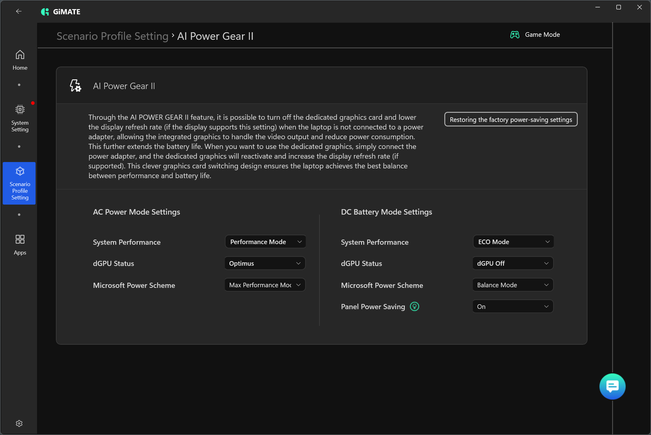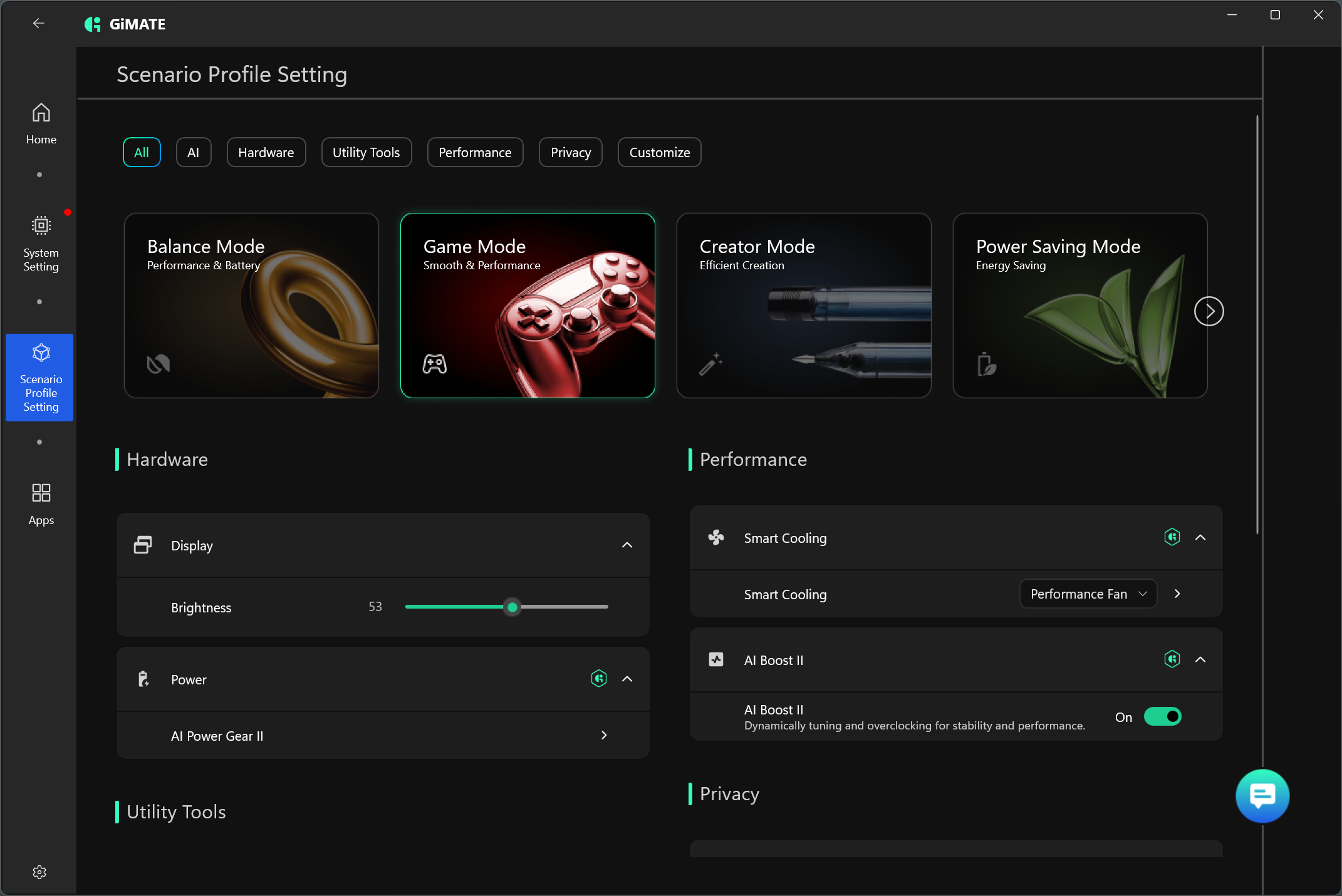 Третим сверху слева помещается блок выбора профилей. Предусмотрена возможность раздельной настройки и других параметров для каждого пресета: яркости экрана, управления энергопотреблением, «умного» охлаждения, а также опция ускорения при посредстве ИИ.