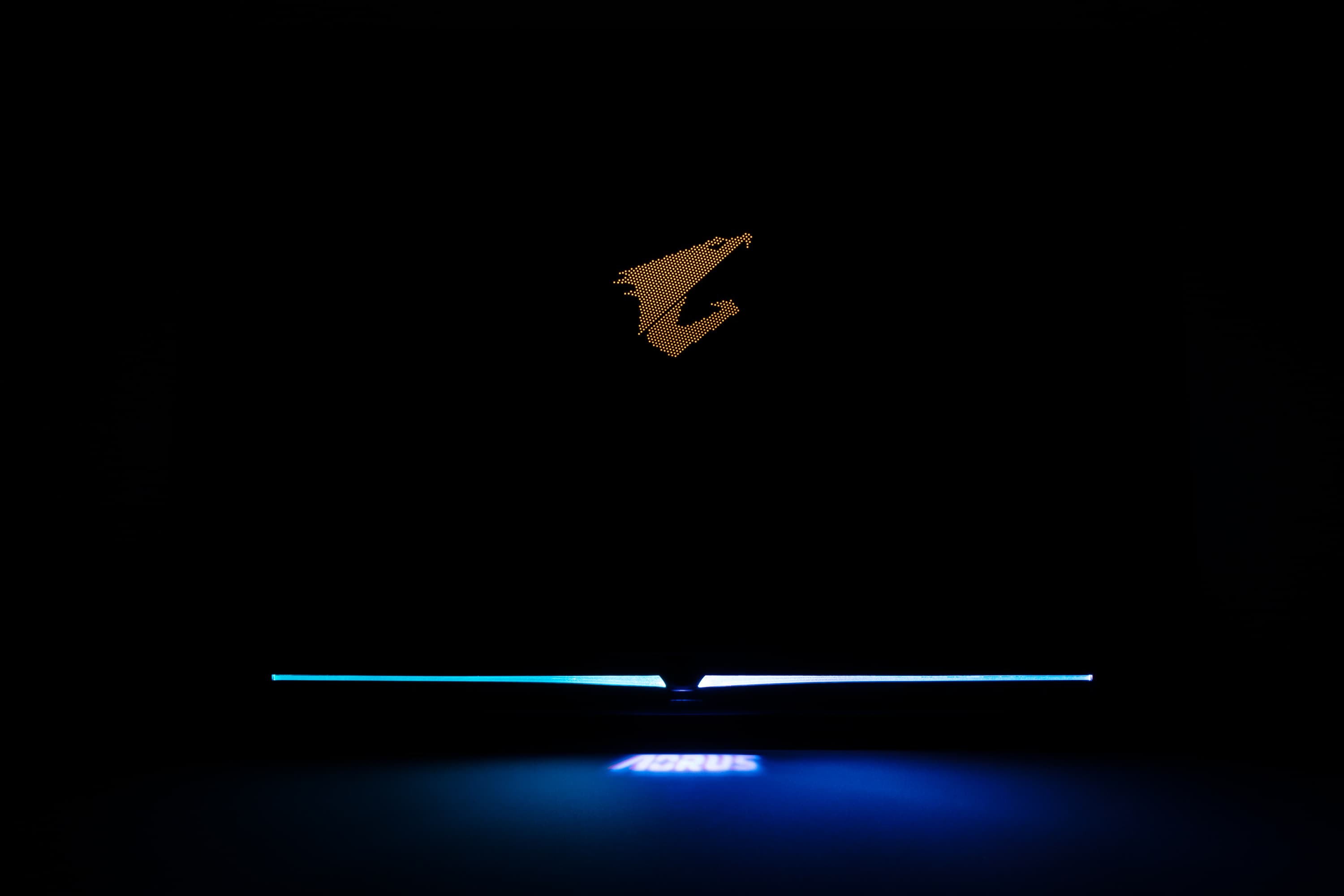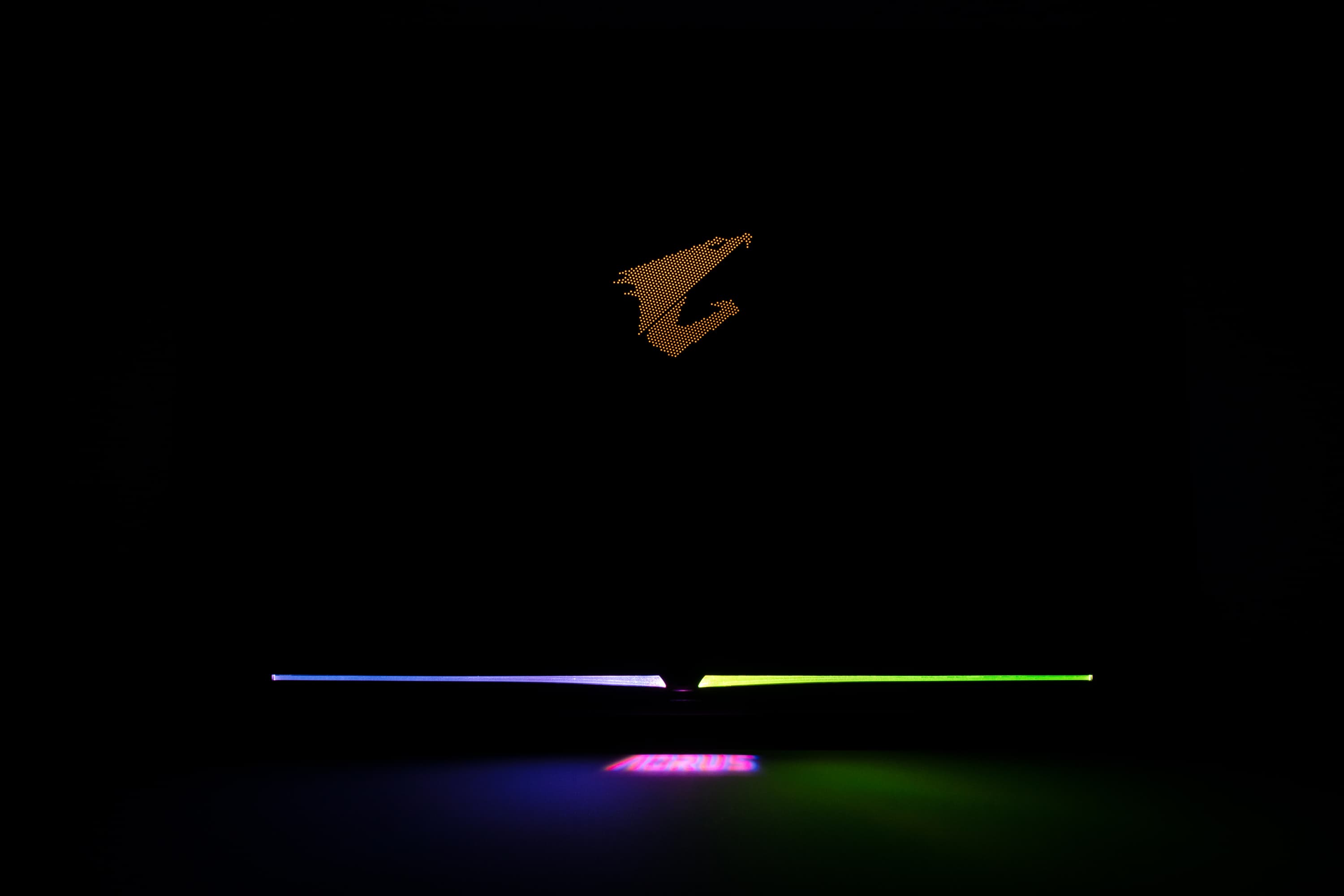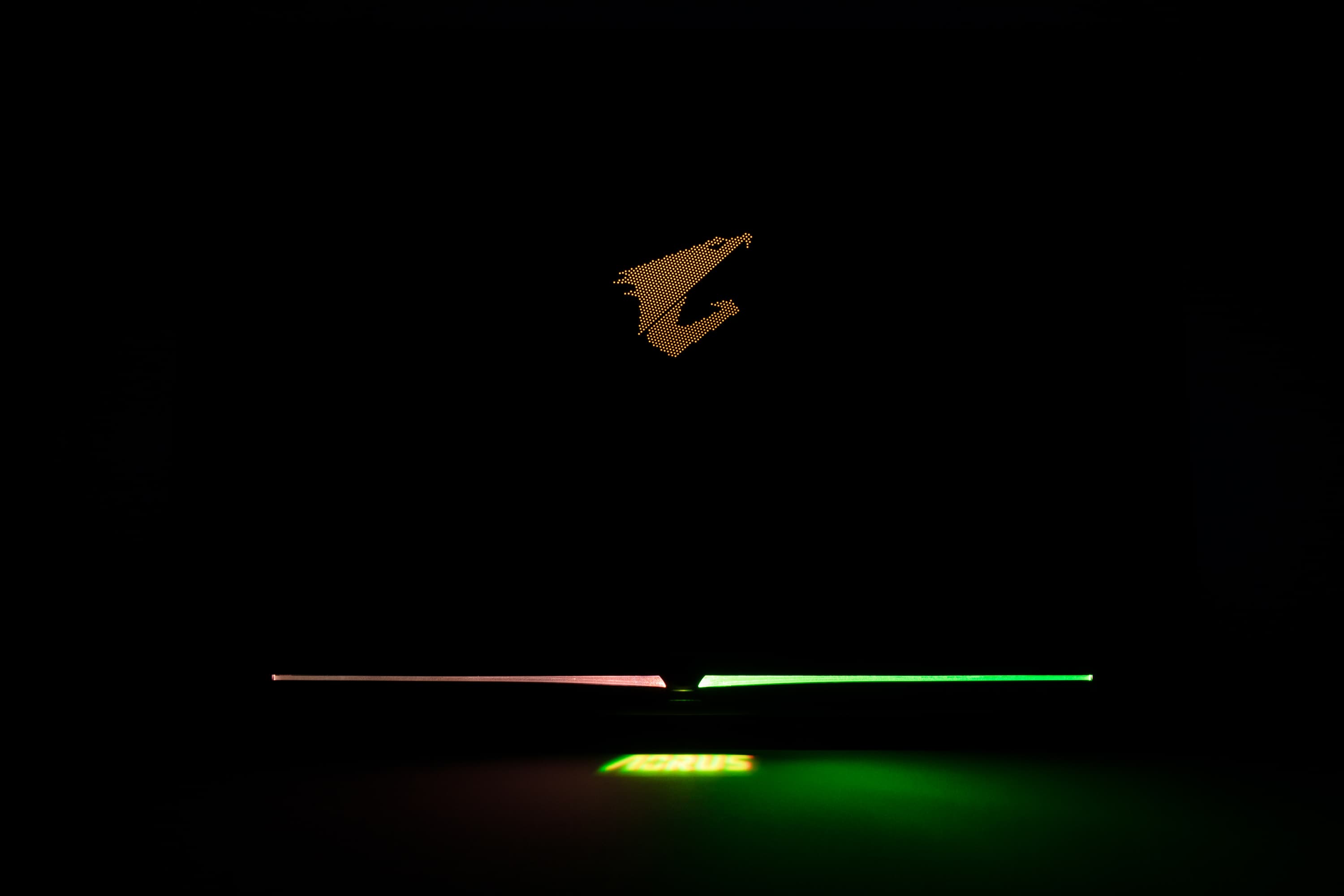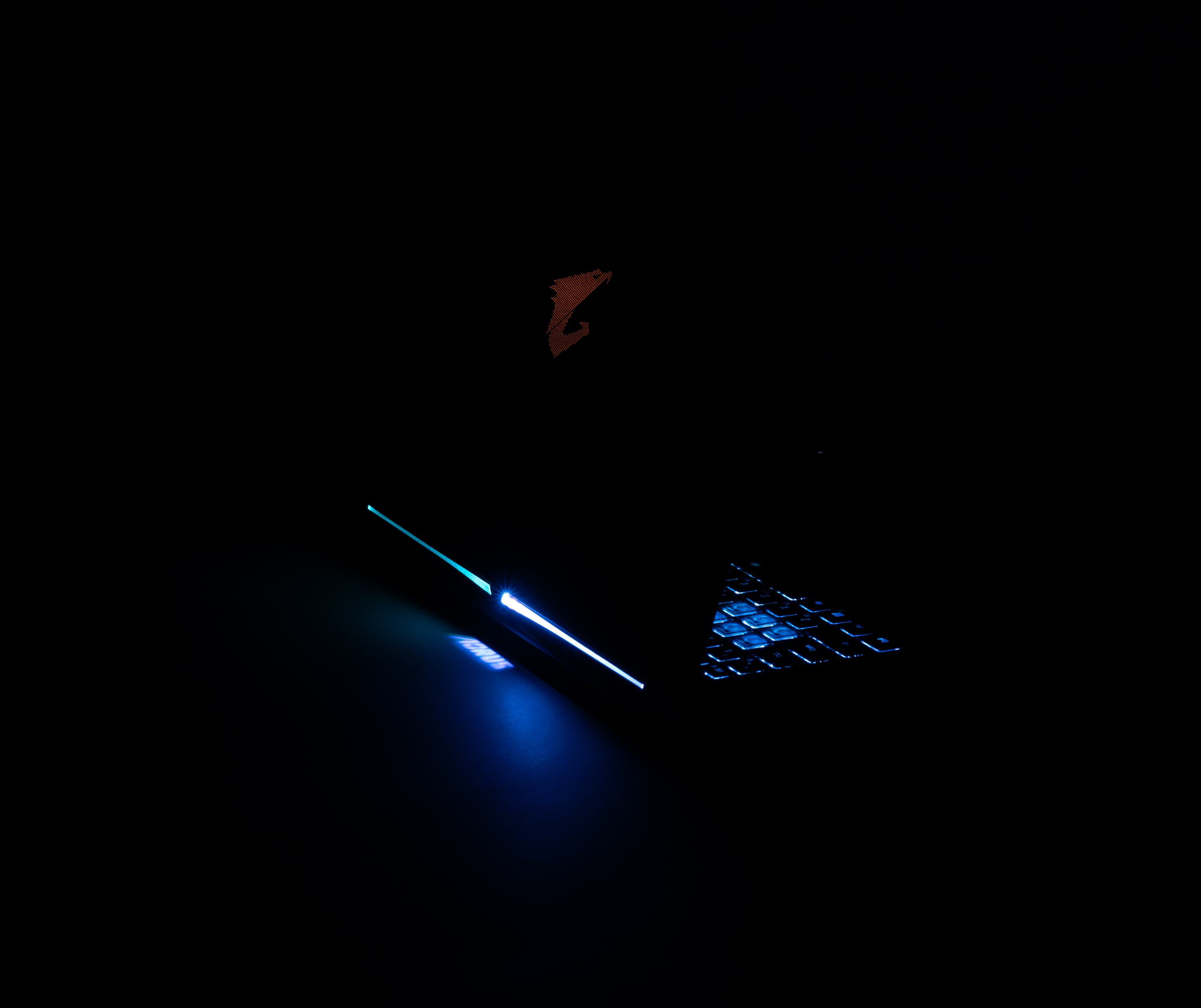 На нижней кромке крышки имеется небольшое расширение, в котором скрыт микропроектор. При включении подсветки клавиатуры он отбрасывает на стол надпись Aorus.
