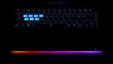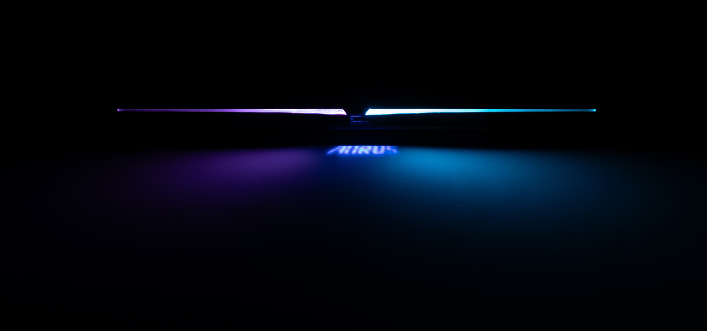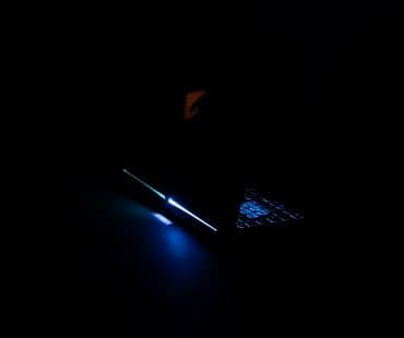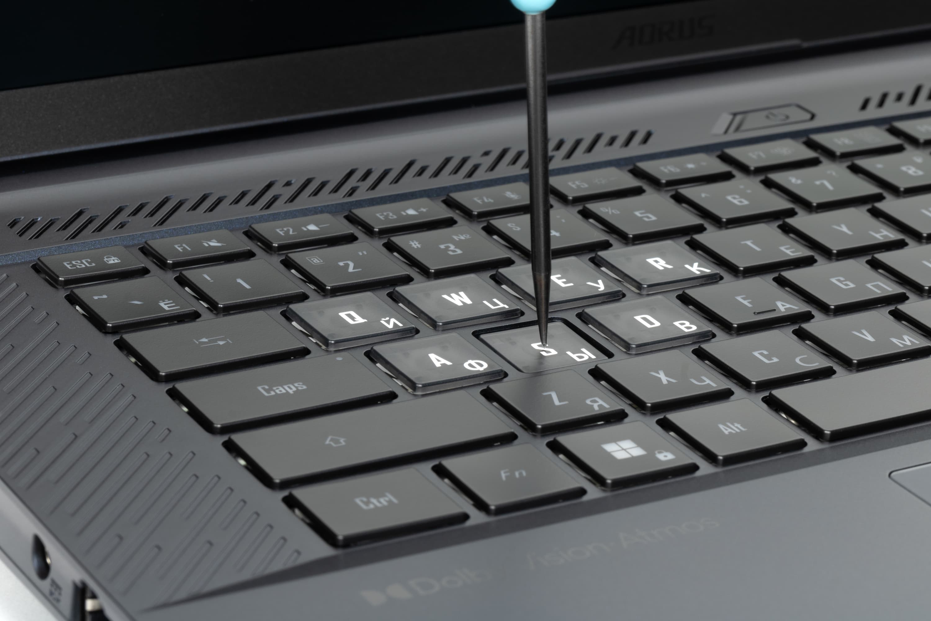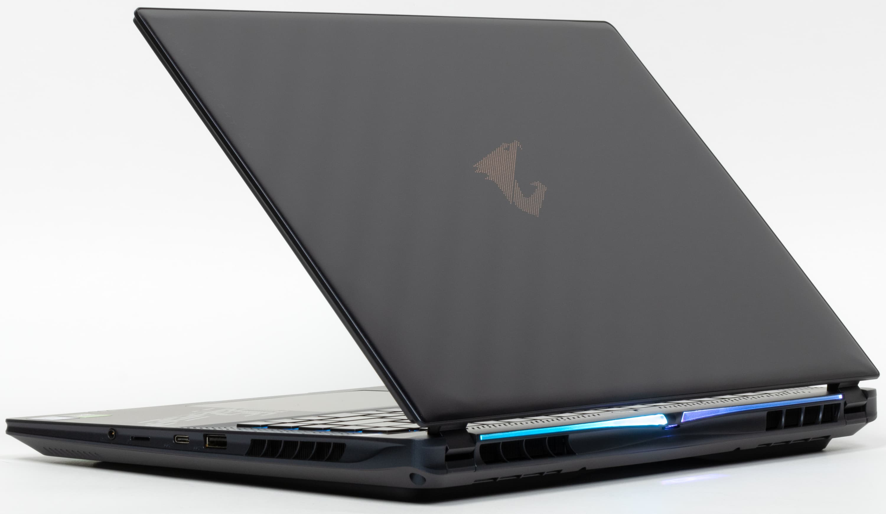 На нижней кромке крышки имеется небольшое расширение, в котором скрыт микропроектор. При включении подсветки клавиатуры он отбрасывает на стол надпись Aorus.