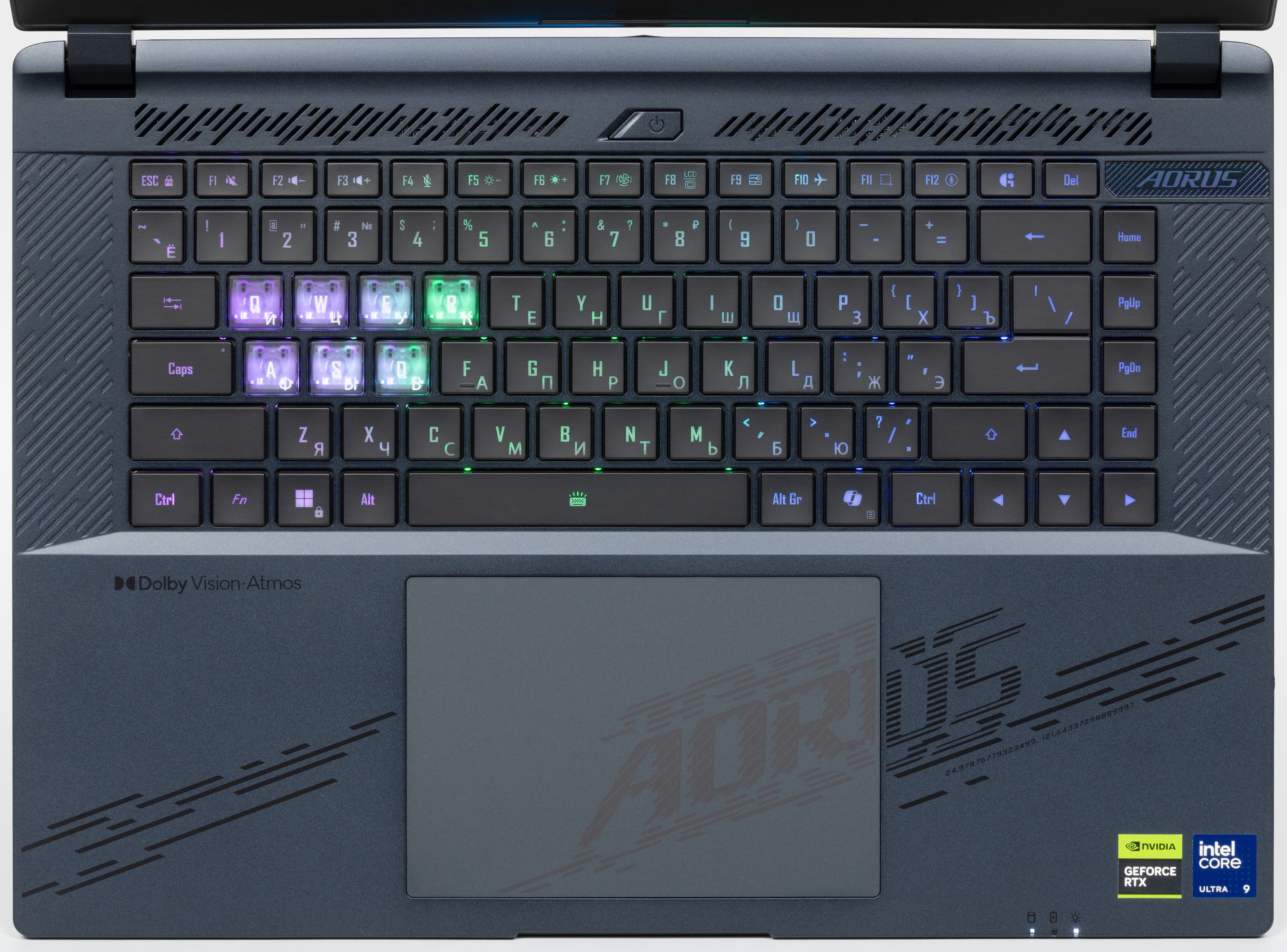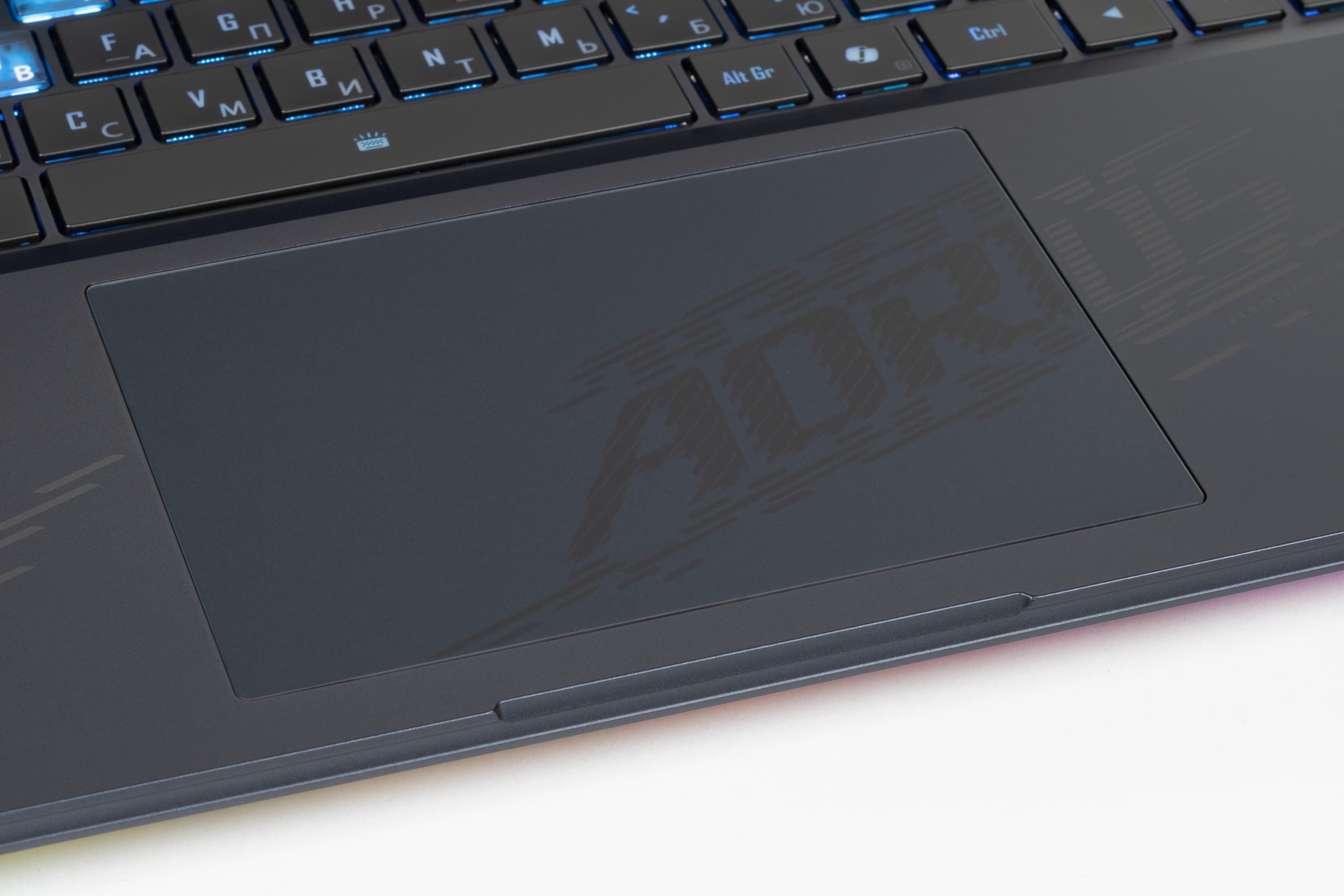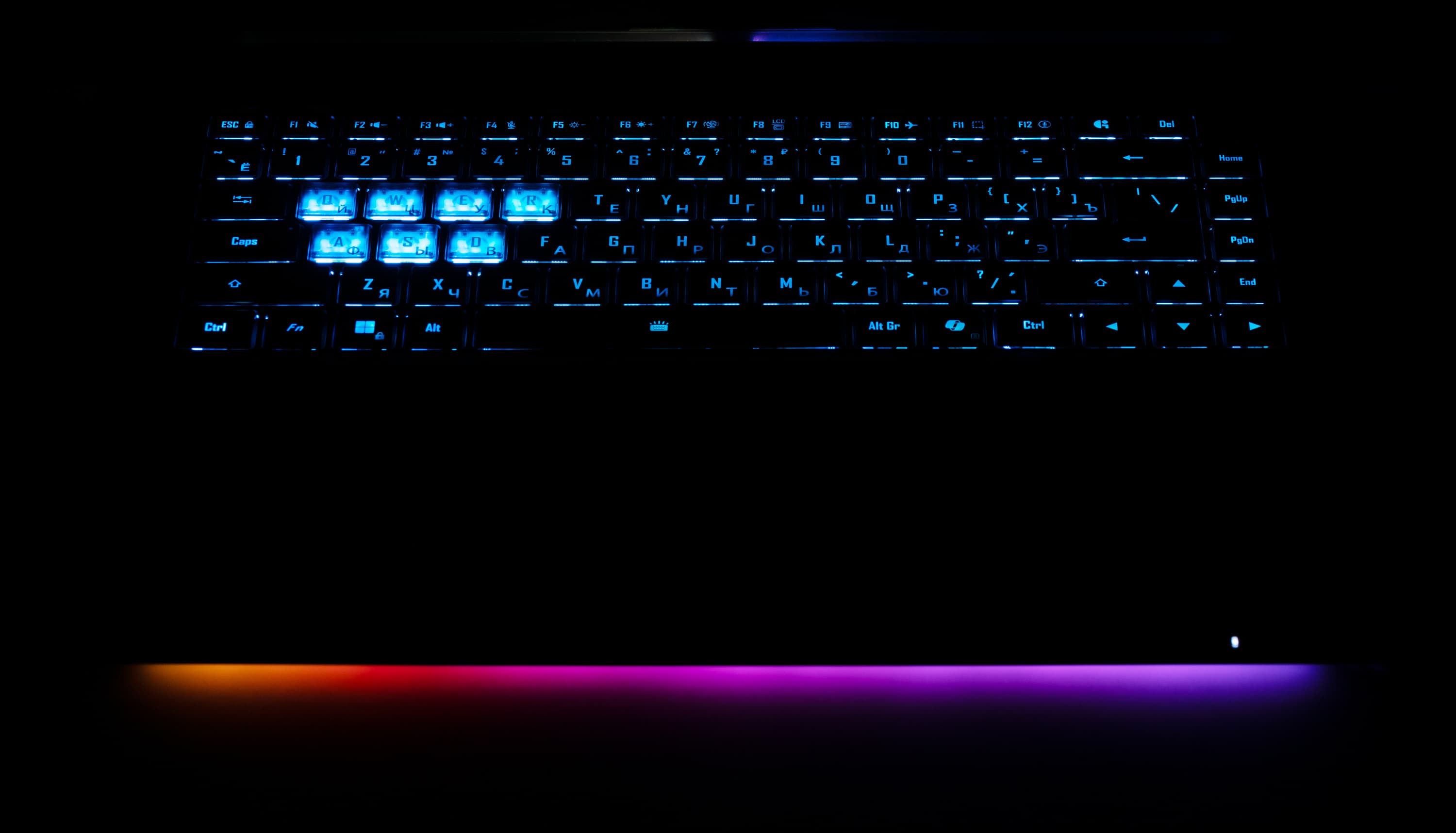 Клавиатура оснащена динамической RGB-подсветкой. Предусмотрено четыре уровня яркости (пятое состояние — подсветка выключена). Изменение интенсивности производится повторными нажатиями аккорда Fn+пробел. Подсвечиваются символы и значительно сильнее — контуры клавиш. Распределение света и специфика маркировки позволяют хорошо видеть латинские символы, а кириллические — немного хуже.