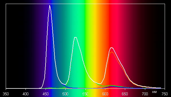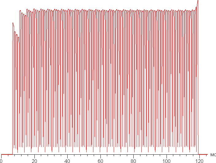 Видно, что на высокой и средней яркости скважность модуляции низкая, к тому же фаза модуляции различается по площади экрана, а частота довольно высокая, в итоге видимого мерцания нет и наличие модуляции не обнаруживается в тесте на стробоскопический эффект. При сильном снижении яркости (примерно ниже 20%, что соответствует 19 кд/м²) скважность значительно возрастает и наличие модуляции при желании уже можно обнаружить в тесте на стробоскопический эффект. Однако просто глазом мерцание все равно не обнаруживается ни при каких условиях. В любом случае можно утверждать, что в рабочем диапазоне яркости (390 — 19 кд/м²) нет ни мерцания, ни модуляции, хоть как-то способной повлиять на самочувствие пользователя.