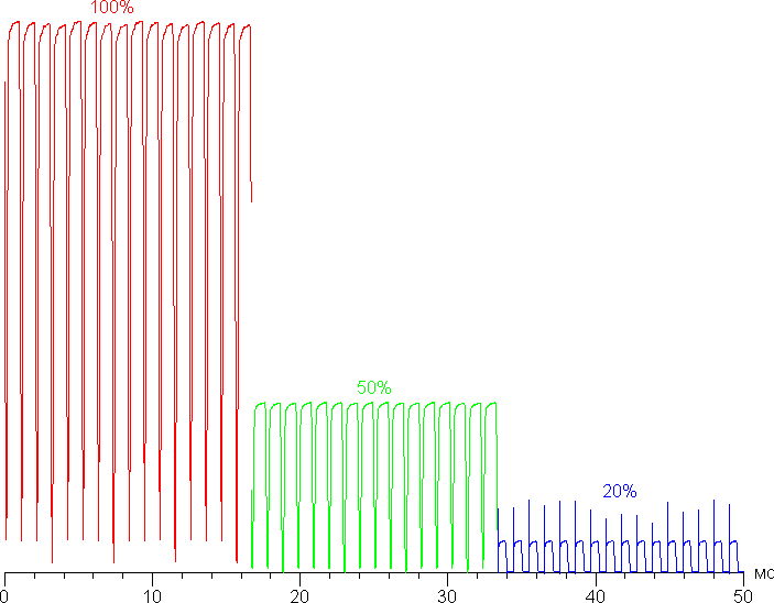 На любом уровне яркости присутствует значимая модуляция с частотой 960 Гц. На рисунке ниже приведены зависимости яркости (вертикальная ось) от времени (горизонтальная ось) для нескольких значений настройки яркости (зависимость реальной яркости от %% шкалы очень нелинейная):