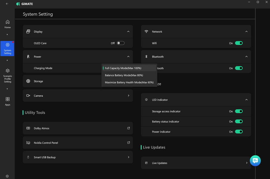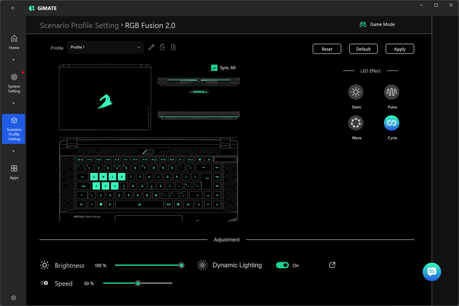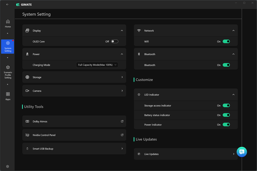Aorus Master 16 AM6H поставляется с Windows 11, триал-версией Microsoft Office 365, сетап-инициатором Яндекс и фирменной утилитой GiMate. Последняя представляет наибольшую ценность при испытаниях машины, поскольку дает возможность выбирать сценарии (профили, пресеты) работы.