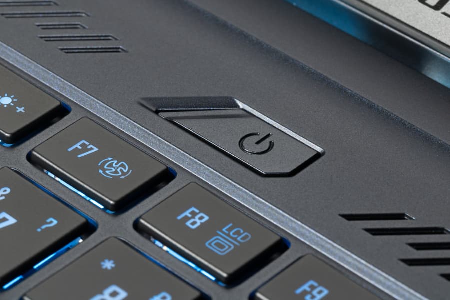 Кнопка включения питания располагается за клавиатурой посередине лицевой панели. Поэтому ее нельзя перепутать с другими и нажать по ошибке.