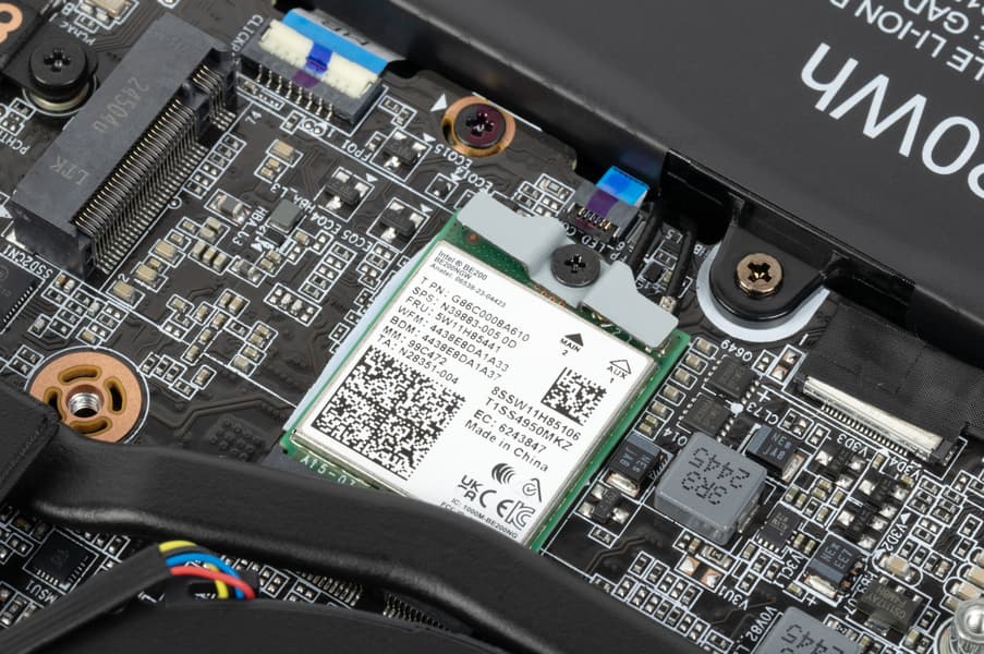 Адаптер беспроводной связи — трехдиапазонный (2,4/5/6 ГГц) Intel BE200NGW. Он соответствует классу Wi-Fi 7, поддерживает стандарт связи 802.11be и обеспечивает одновременный прием и передачу сигнала с помощью двух антенн при множественных одновременных подключениях (2×2 MIMO).