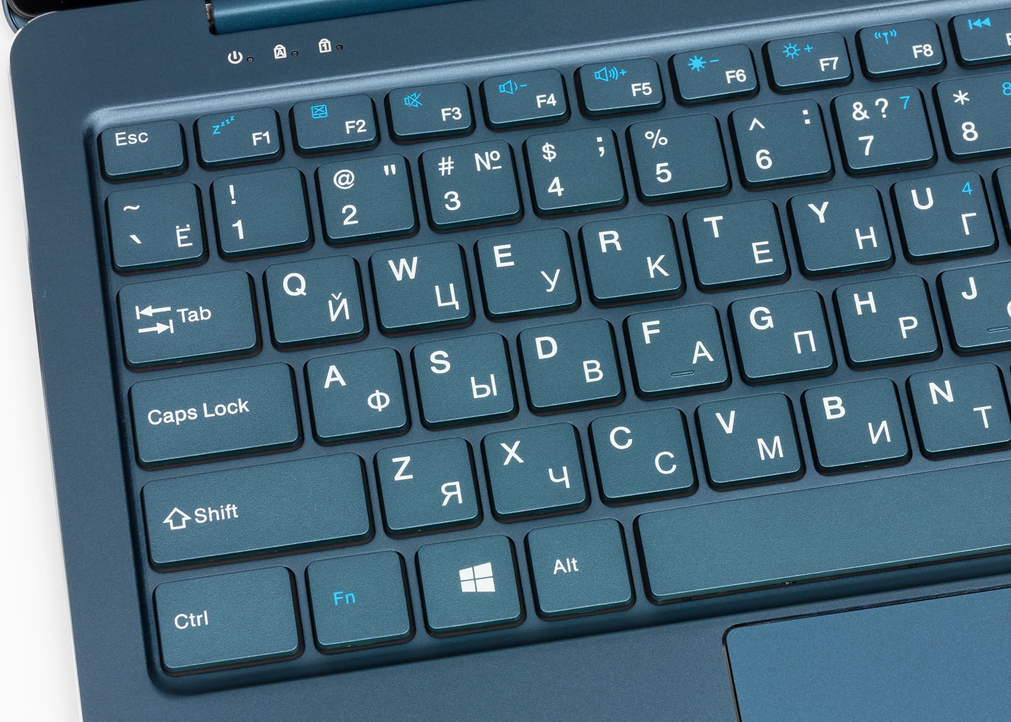 Сами клавиши по цвету выполнены в тон корпусу ноутбука, а символы на них — белые. Подсветки у клавиатуры нет, но символы на клавишах контрастные и хорошо заметны даже при недостаточном освещении. Основание клавиатуры достаточно жесткое, при нажатии на клавиши оно почти не прогибается. Клавиатура тихая, клавиши при печати не издают клацающих звуков.
