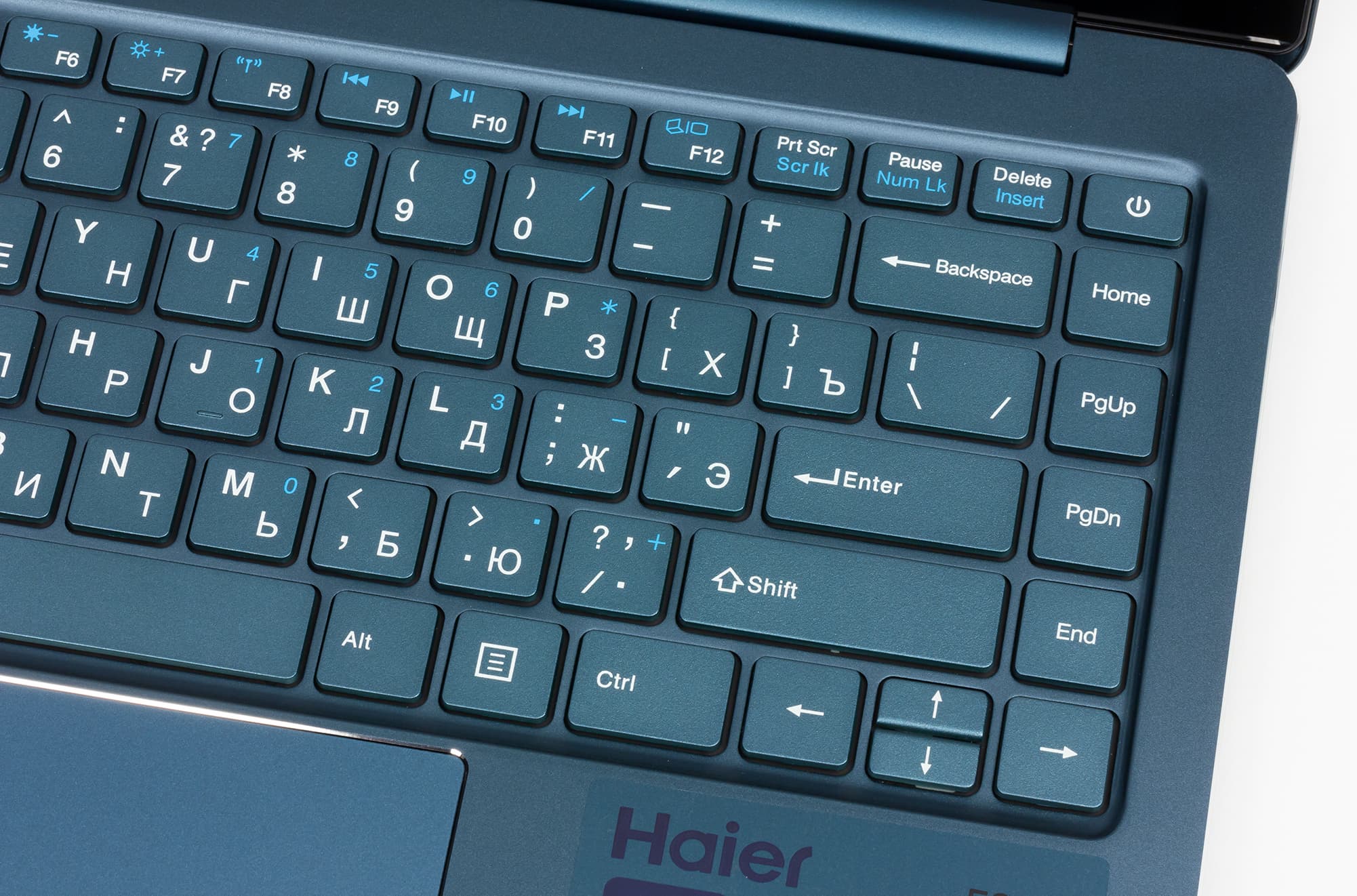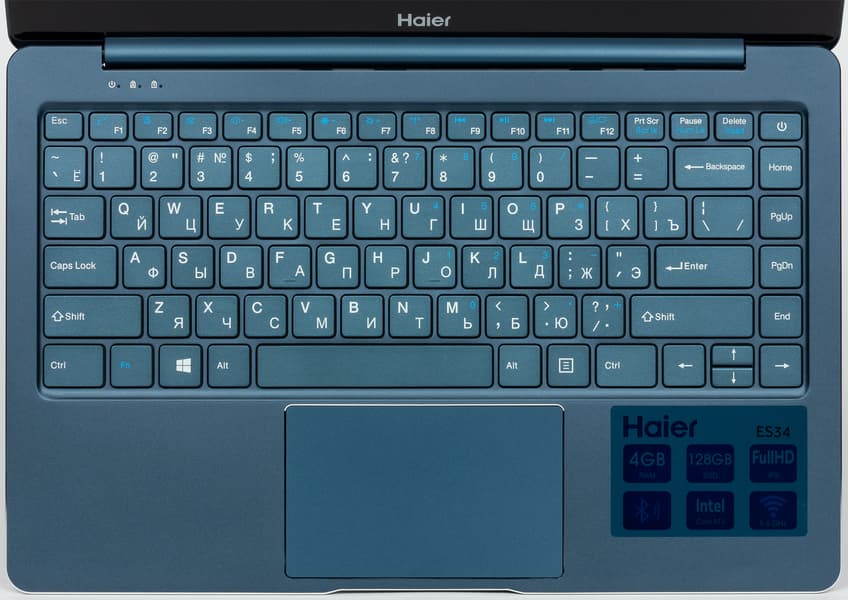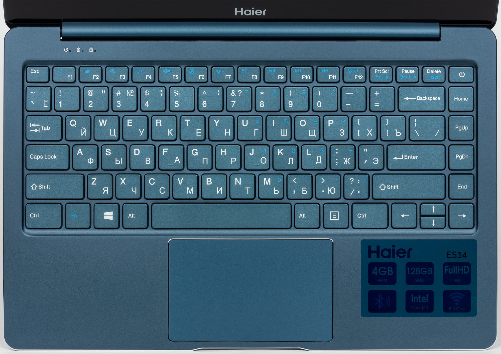 В ноутбуке Haier ES34 используется клавиатура мембранного типа с увеличенным расстоянием между клавишами. Ход клавиш составляет 1,8 мм, размер клавиш — 15,6×15,6 мм, а расстояние между ними — 3 мм.
