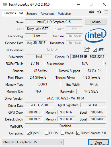 | Видеоподсистема | Intel HD Graphics 615 | |