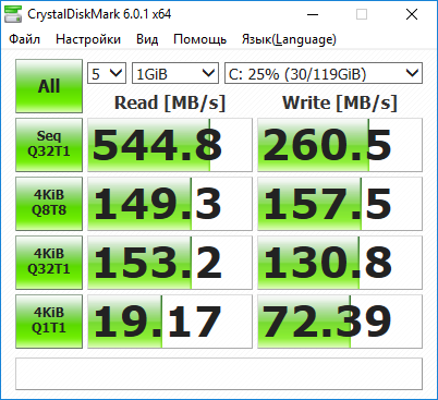 Утилита CrystalDiskMark 6.0.1 демонстрирует примерно аналогичную скорость последовательного чтения.