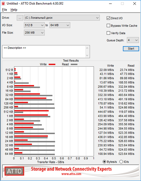 Утилита ATTO Disk Benchmark определяет максимальную скорость последовательного чтения этого накопителя на уровне 520 МБ/с, а скорость последовательной записи не превосходит 450 МБ/с и сильно зависит от размера пакета.