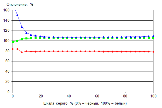 Стабильность цветовой температуры объясняется тем, что основные цвета стабильны по всей шкале серого. Однако уровень красного цвета очень низкий, что отражается на точности цветопередачи.