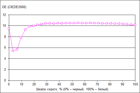 Значение ΔE по всей шкале серого (темные области можно не учитывать) чуть больше 10, что, конечно, не очень хорошо.