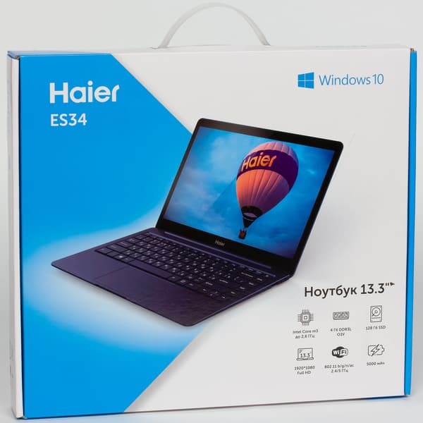 Ноутбук Haier ES34 поставляется в небольшой картонной коробке с ручкой, на которой изображен сам ноутбук и перечислены его краткие характеристики.