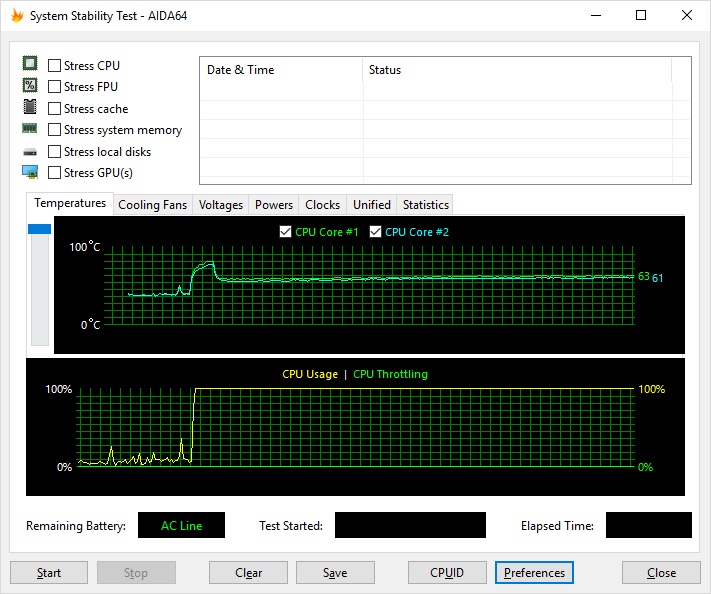 Если загрузить процессор в стрессовом режиме, то частота ядер первоначально будет составлять 2,4 ГГц, но через непродолжительный промежуток времени она опустится до 1,4 ГГц, а температура процессора стабилизируется на уровне 63 °C.