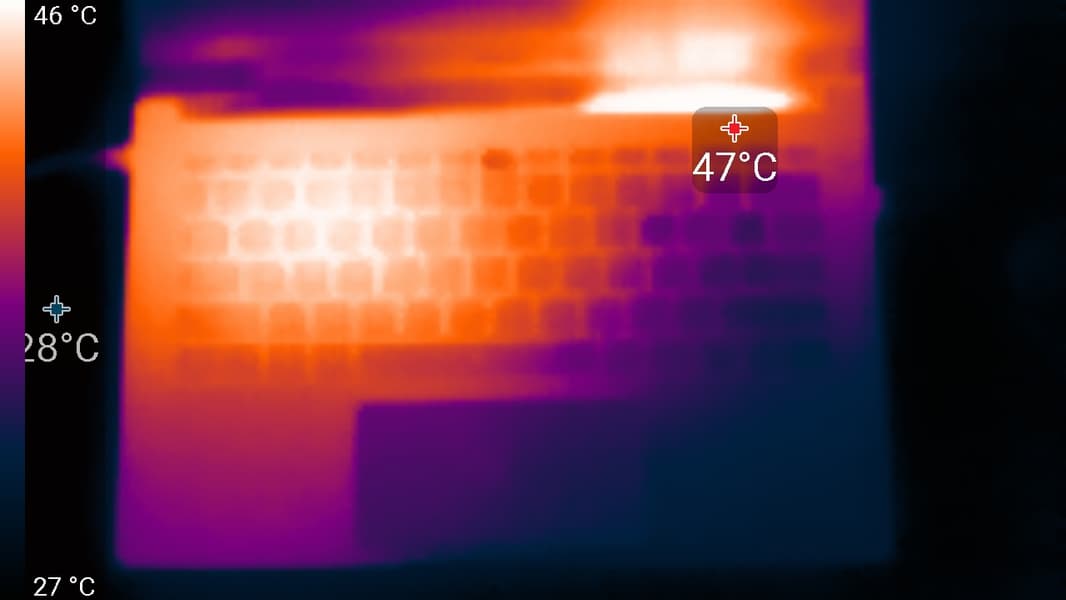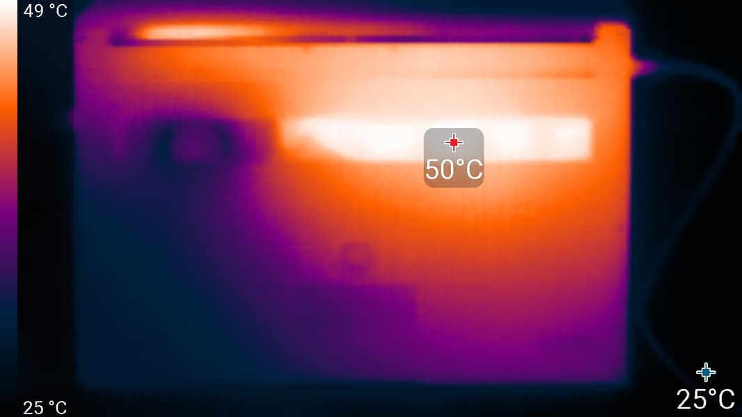 Ниже приведены термоснимки, полученные после долговременной работы ноутбука под максимальной нагрузкой на CPU и GPU (используется комплектный блок питания):