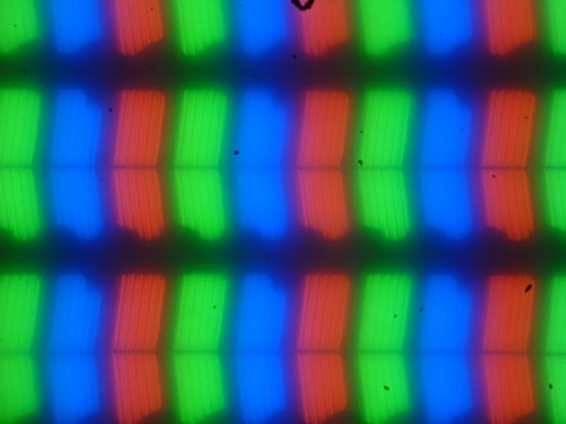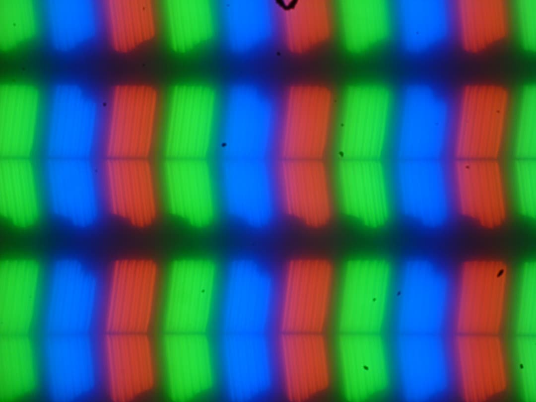 В этом ноутбуке используется матрица типа IPS. Микрофотографии демонстрируют типичную для IPS структуру субпикселей (черные точки — это пыль на матрице фотоаппарата):