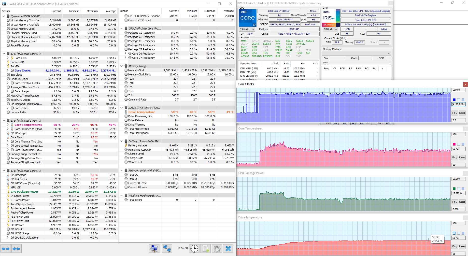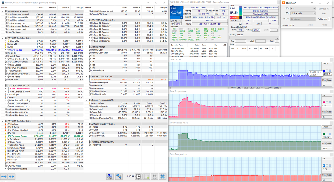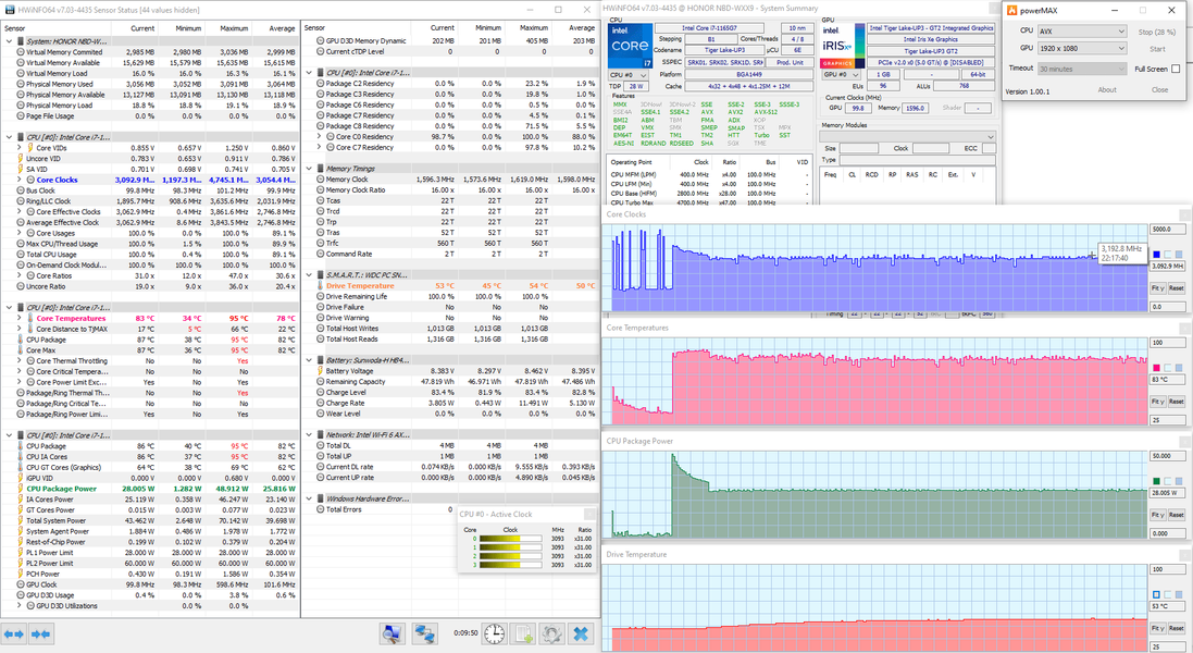 Мы протестировали Honor MagicBook 14 в режиме Performance в стресс-тесте powerMax (с AVX-инструкциями) при питании от комплектного адаптера, а также при питании от аккумулятора. Мониторинг осуществлялся с помощью утилиты HWinfo, температура в помещении во время теста составляла 26 °C.