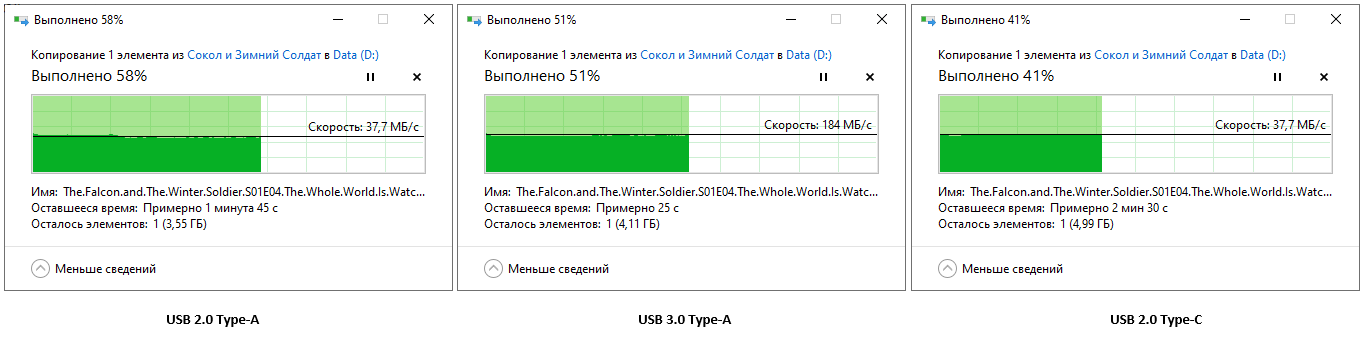 | Скорость копирования данных, c | 42,62 | 10,98 | 19,88 |