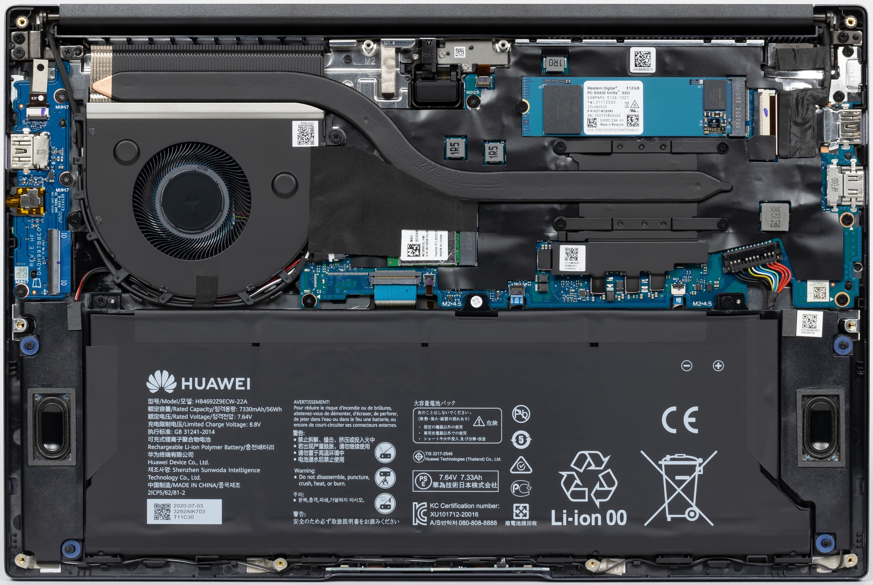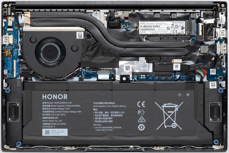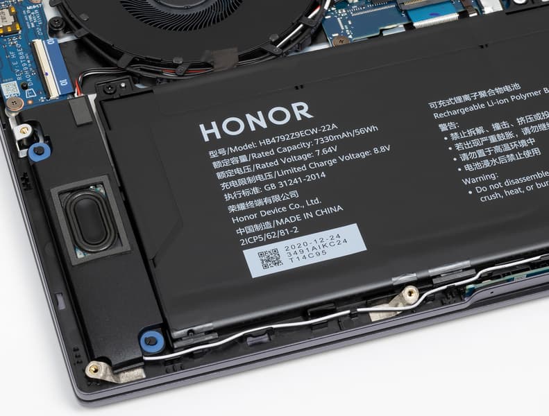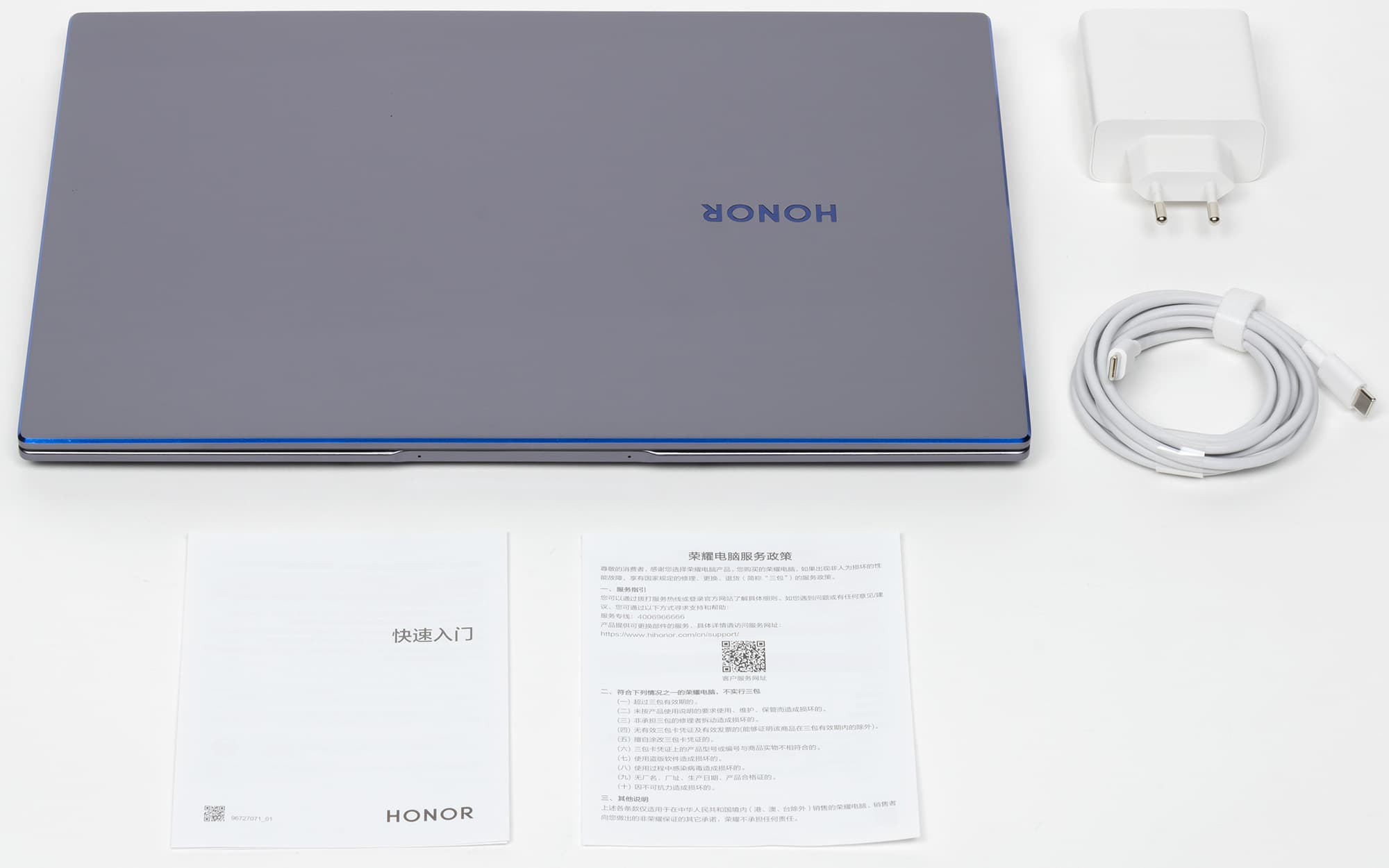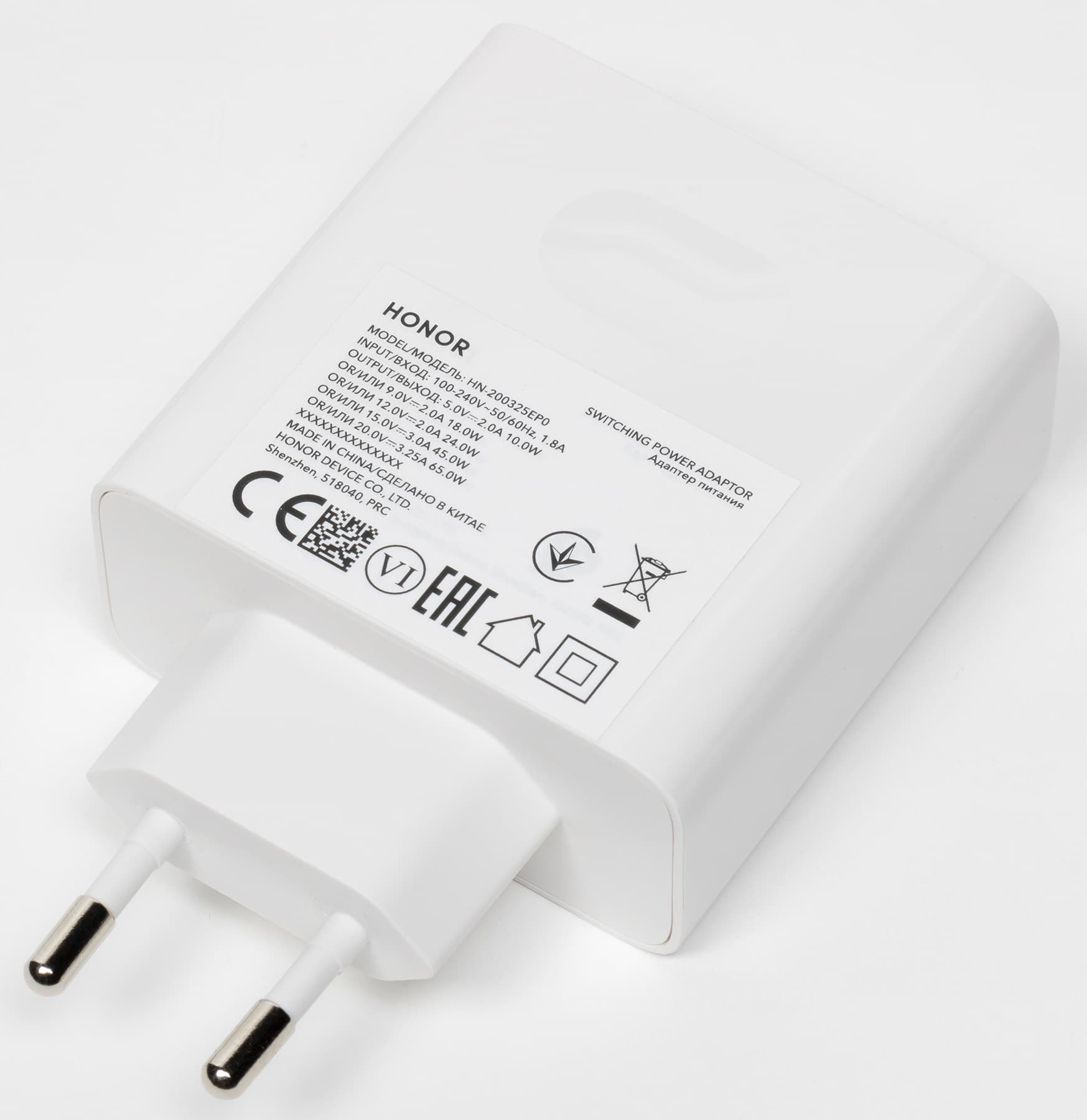 Мощность компактного и легкого (157 г) адаптера питания с маркировкой HW-200325EP0 у Honor MagicBook 14 (2021) точно такая же, как у прошлогодней модели, и составляет 65 ватт (20,0 В, 3,25 А).