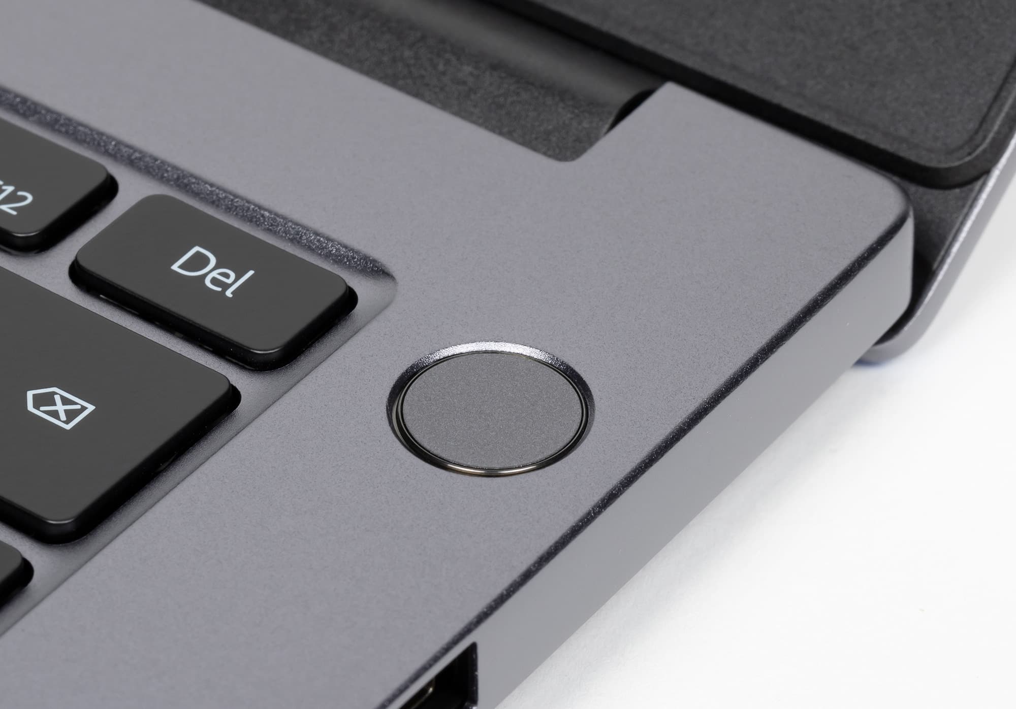 Сверху справа на рабочей панели размещена кнопка включения ноутбука со встроенным сканером отпечатков пальцев.