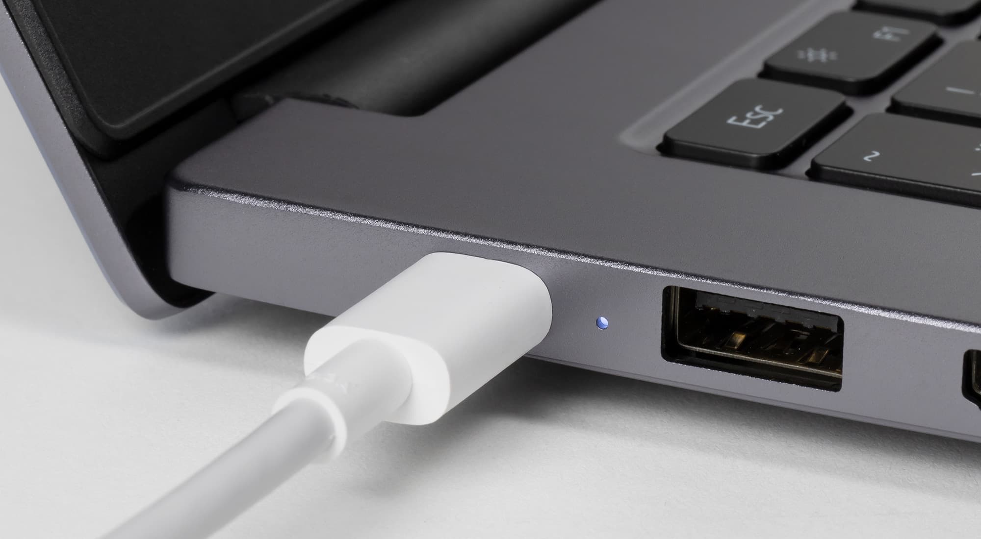 Он подключается к ноутбуку кабелем с разъемами USB Type-C, а мигающий светодиод белого цвета проинформирует о статусе заряда аккумулятора.