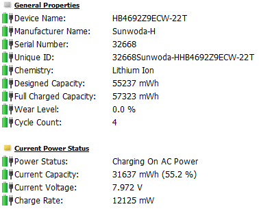 По данным производителя, аккумулятор должен заряжаться более чем на 44% всего за 30 минут, однако это соответствует действительности, только если ноутбук в процессе зарядки не нагружать ресурсоемкими приложениями. В последнем случае он будет заряжаться медленнее, а при запуске стресс-теста и вовсе будет разряжаться. Полный цикл зарядки ноутбука с уровня 3% до 100% занимает 2 часа и 13 минут (усредненный результат трех циклов).