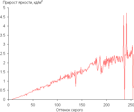 Далее мы измерили яркость 256 оттенков серого (от 0, 0, 0 до 255, 255, 255). График ниже показывает прирост (не абсолютное значение!) яркости между соседними полутонами: