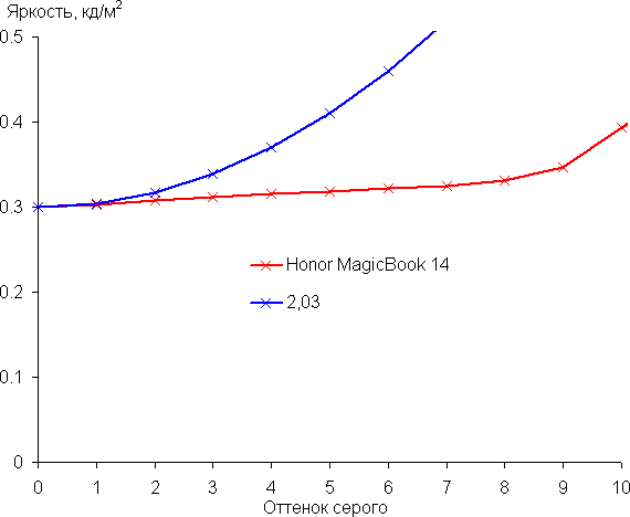 Рост прироста яркости довольно равномерный, и почти каждый следующий оттенок ярче предыдущего. Однако в самой темной области визуально первый оттенок серого по яркости от черного не отличается, да и последующие различаются плохо, так как прирост яркости в тенях медленный: