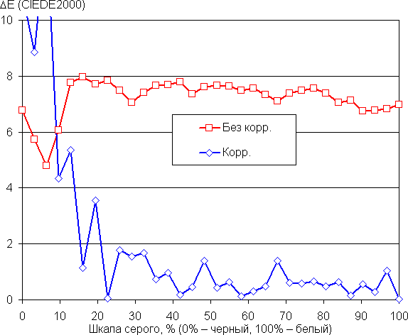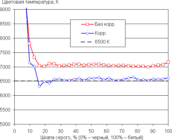 Баланс оттенков на шкале серого хороший (графики Без корр. на рисунках ниже), так как цветовая температура достаточно близка к стандартным 6500 К, и отклонение от спектра абсолютно черного тела (ΔE) ниже 10, что для потребительского устройства считается приемлемым показателем. При этом цветовая температура и ΔE мало изменяются от оттенка к оттенку — это положительно сказывается на визуальной оценке цветового баланса. (Самые темные области шкалы серого можно не учитывать, так как там баланс цветов не имеет большого значения, да и погрешность измерений цветовых характеристик на низкой яркости большая.)